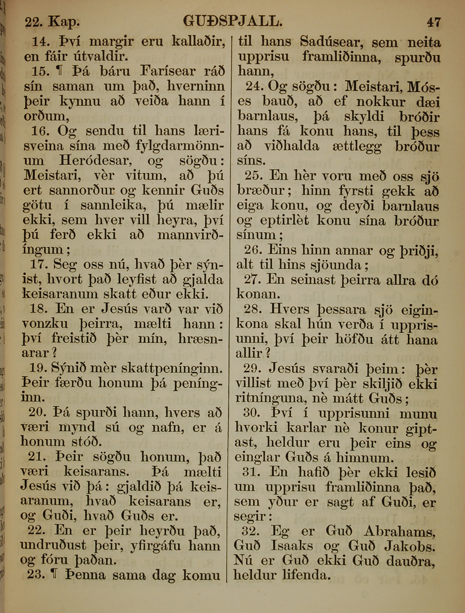 1863年冰島語新約全書 馬太福音 22 章 14 節到 22 章 32 節