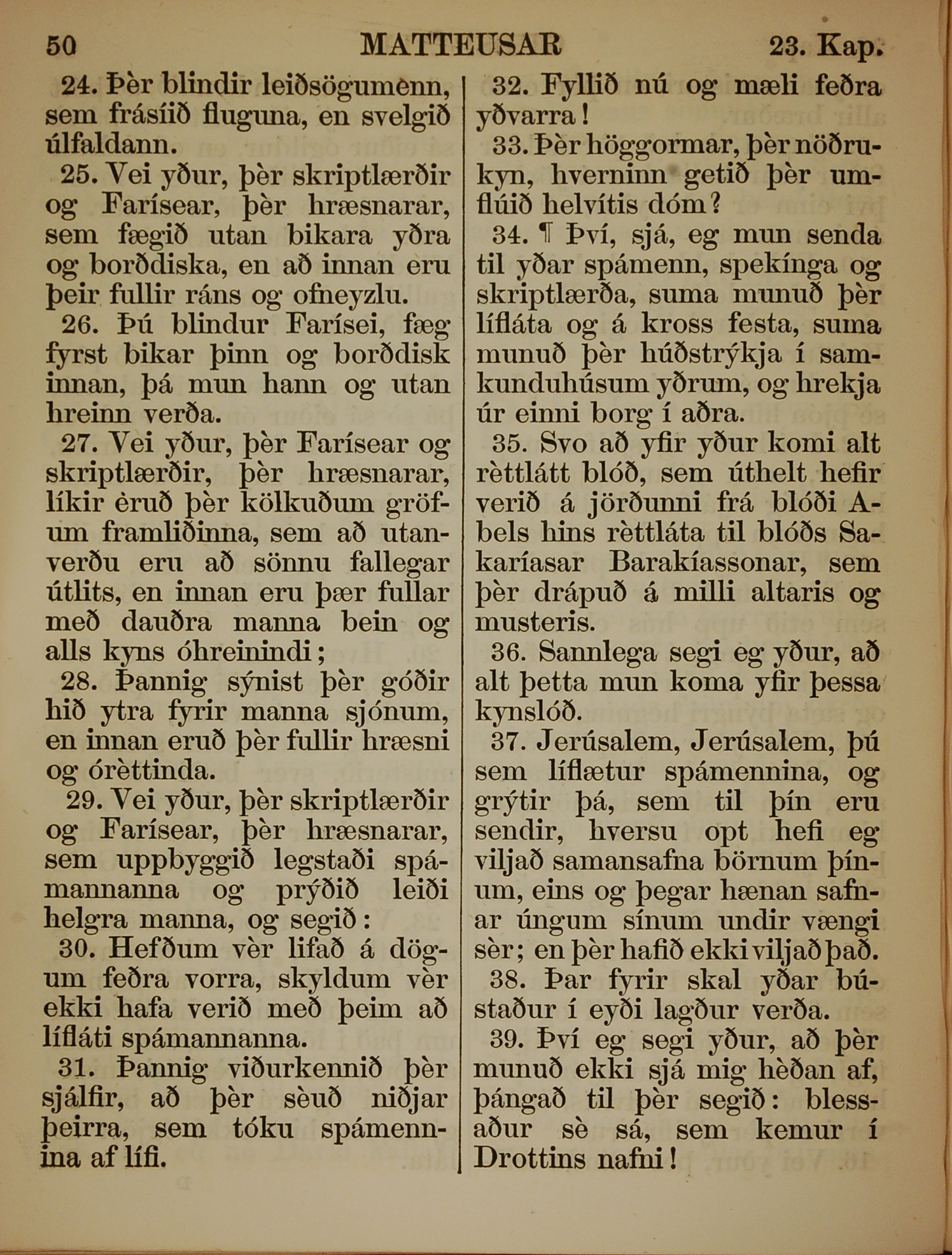 1863年冰島語新約全書 馬太福音 23 章 24 節到 23 章 39 節