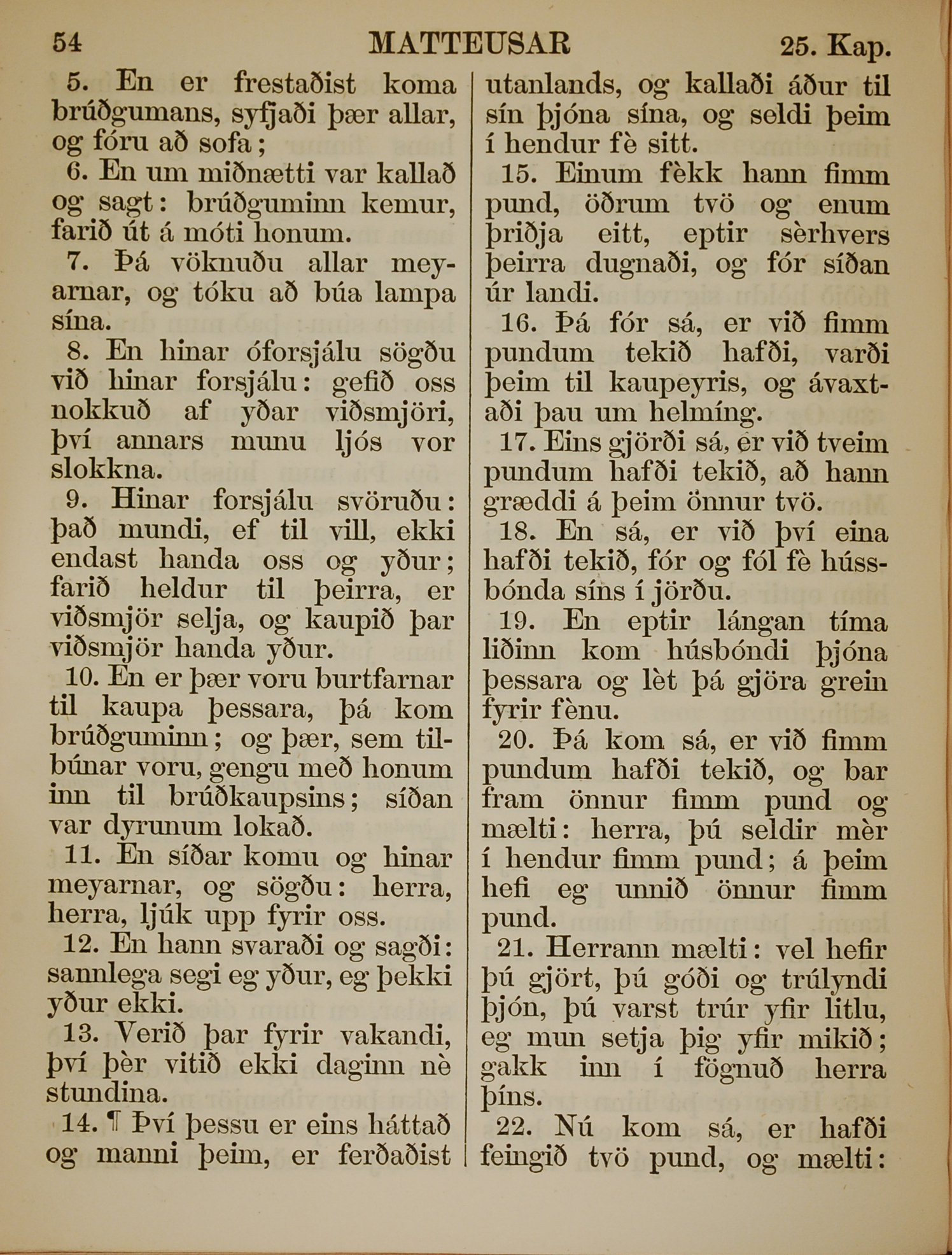 1863年冰島語新約全書 馬太福音 25 章 5 節到 25 章 22 節