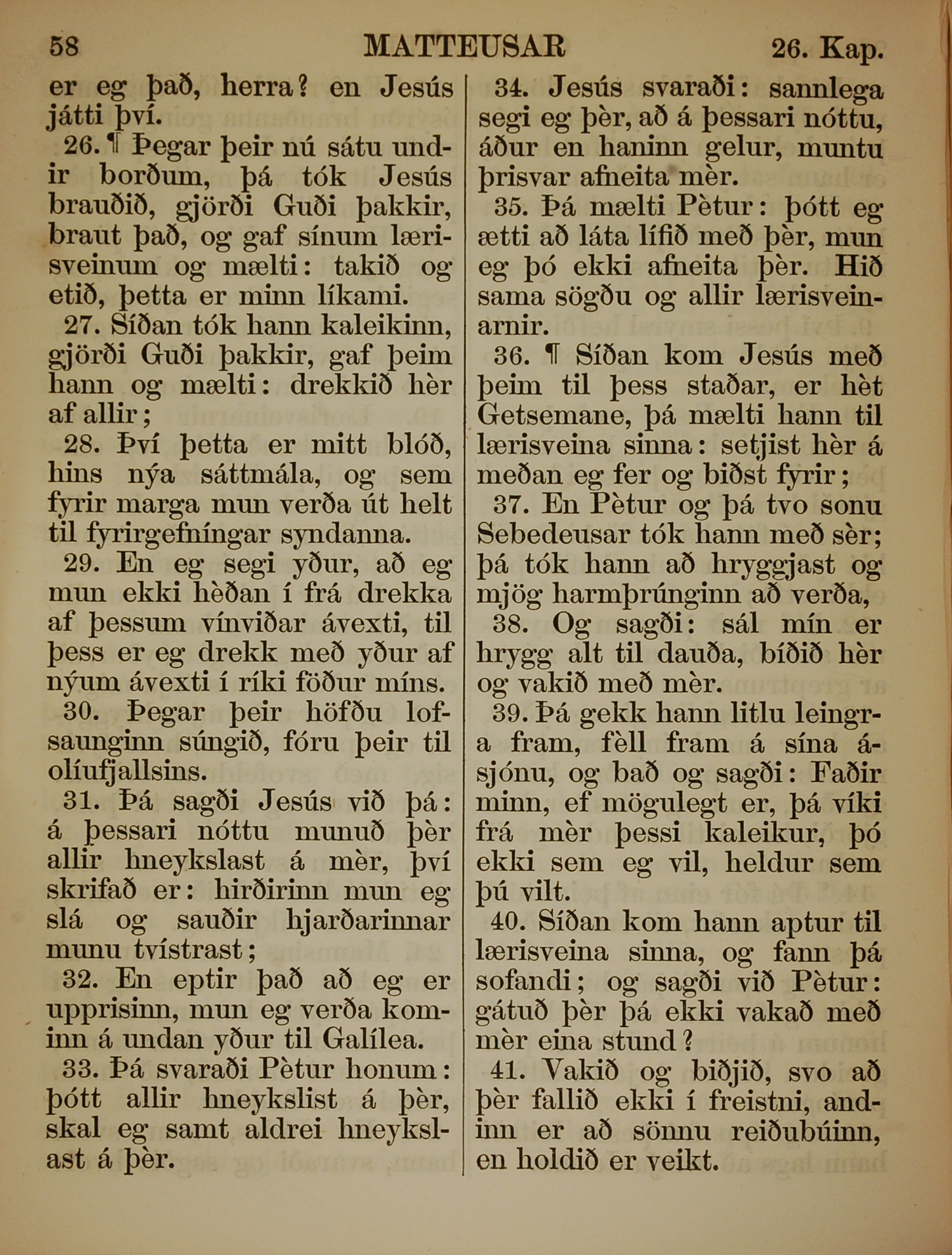 1863年冰島語新約全書 馬太福音 26 章 26 節到 26 章 41 節