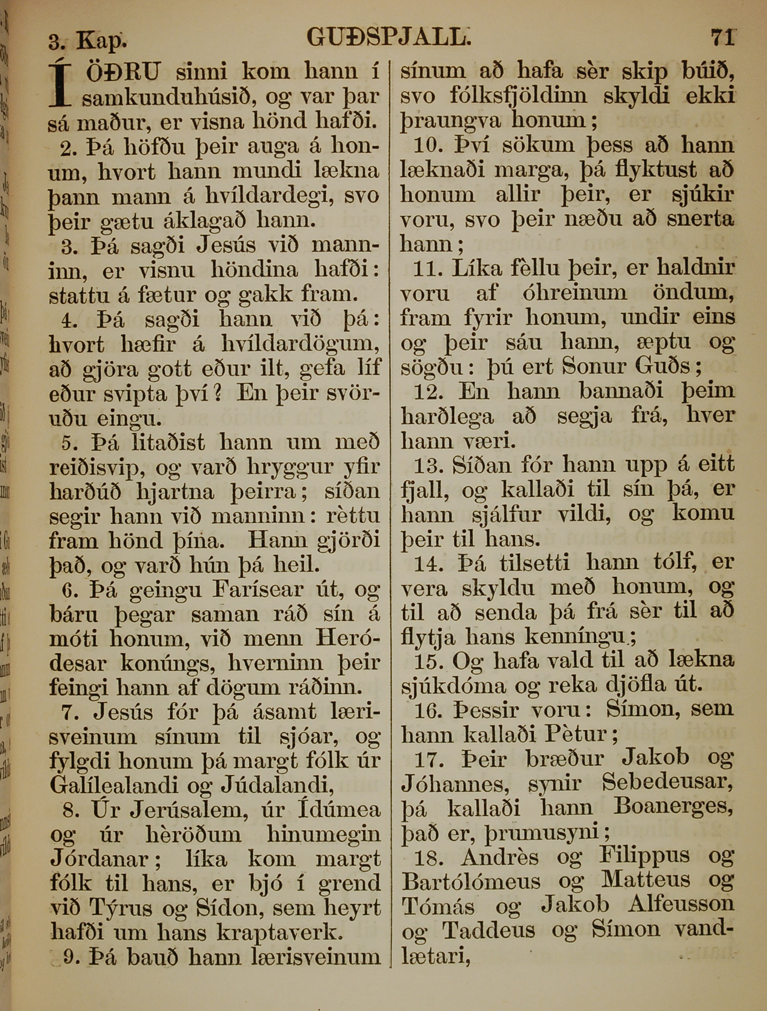1863年冰島語新約全書 馬可福音 3 章 1 節到 3 章 18 節