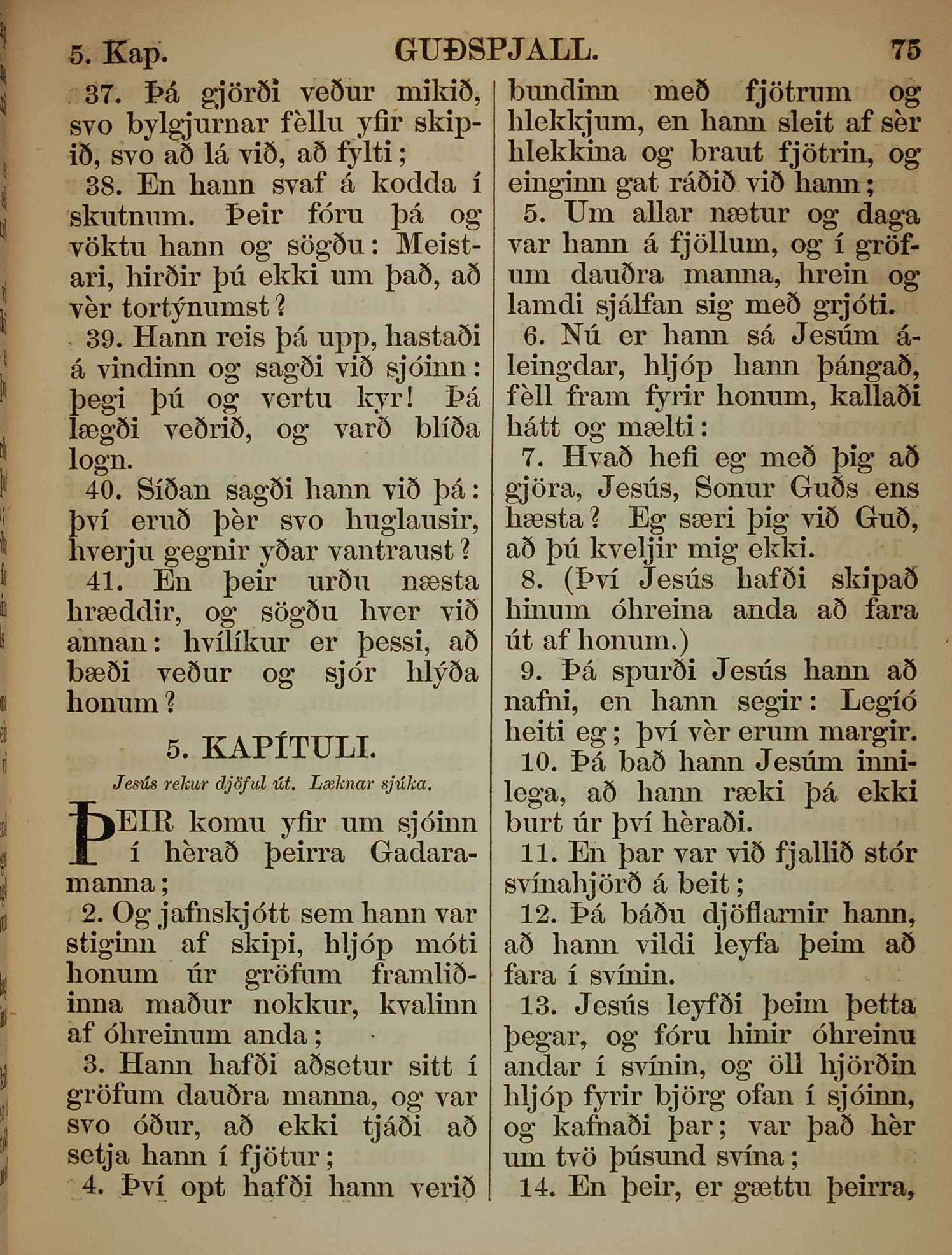 1863年冰島語新約全書 馬可福音 4 章 37 節到 5 章 14 節