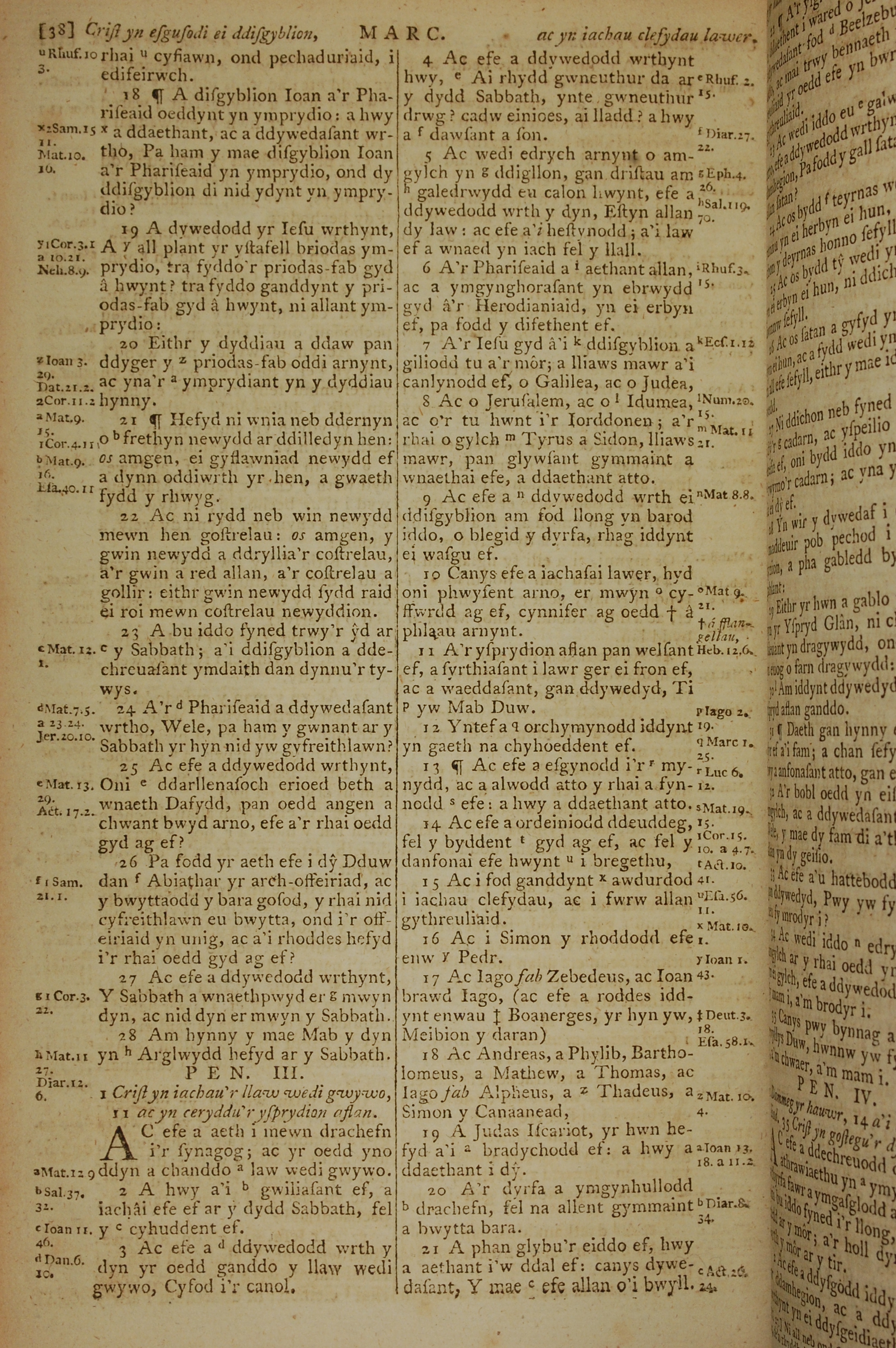 1796年威爾斯文新舊約全書 馬可福音 2 章 18 節到 3 章 21 節
