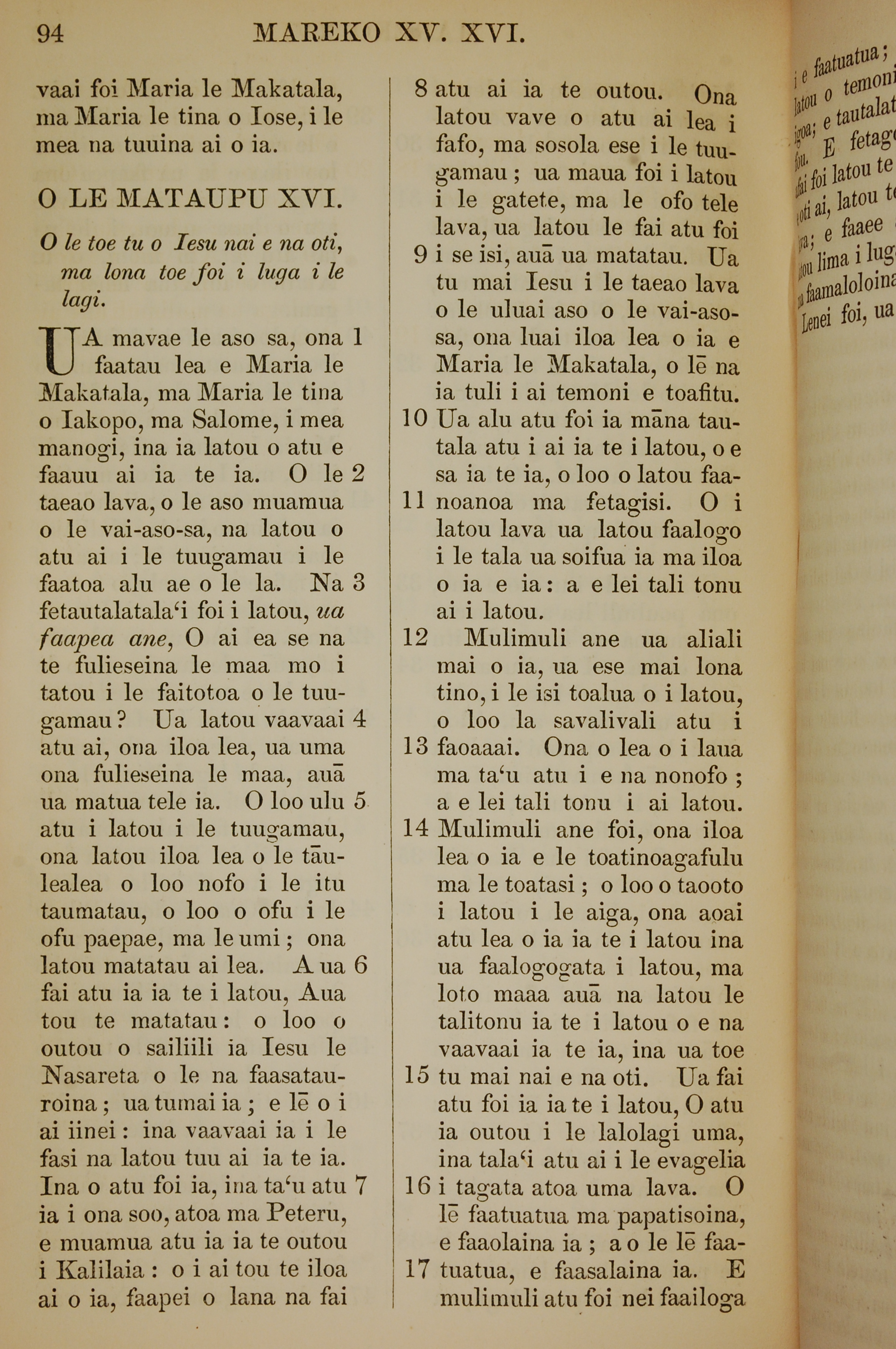 1849年薩摩亞語新約全書 馬可福音 16 章 1 節到 16 章 17 節