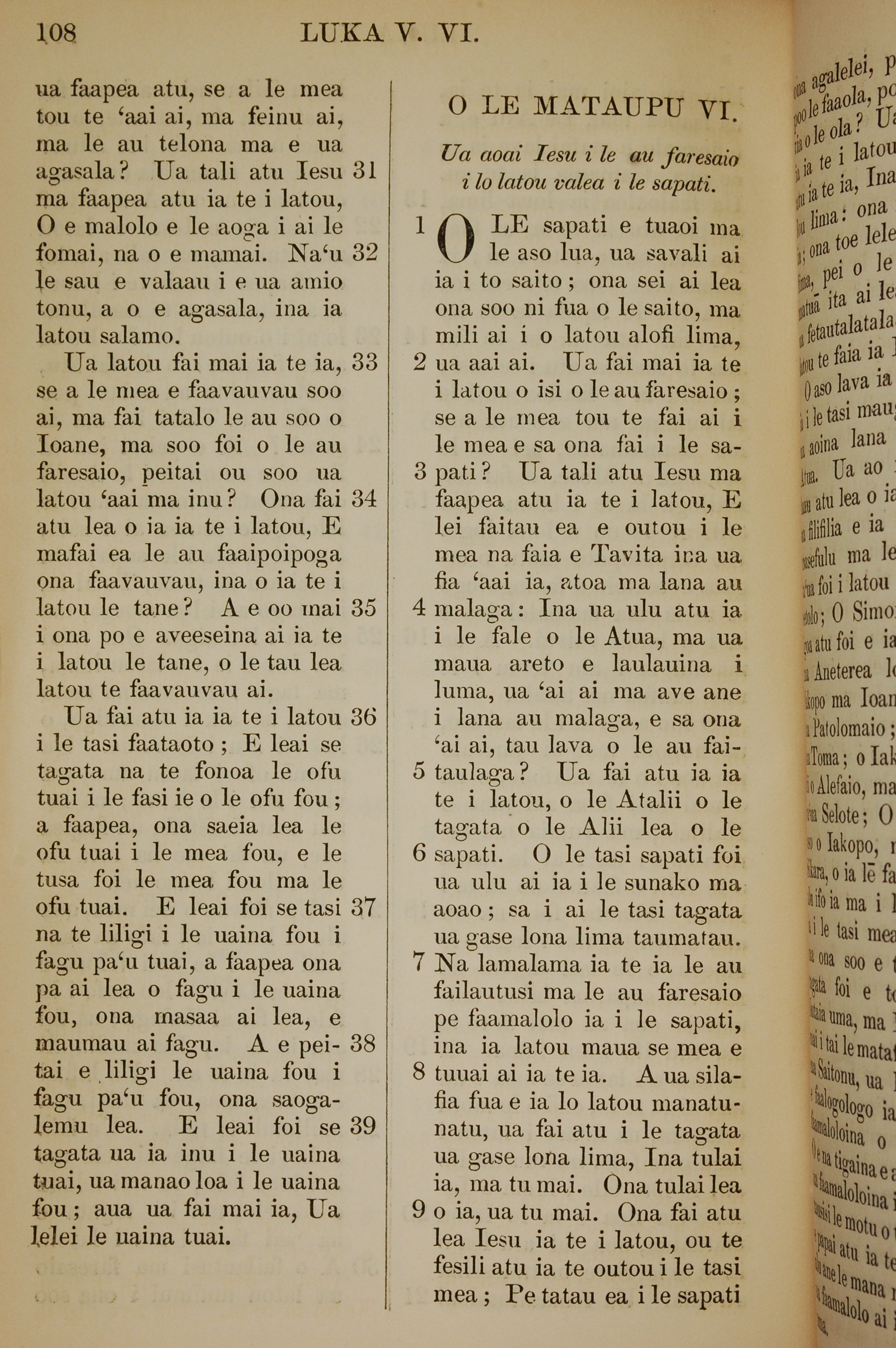 1849年薩摩亞語新約全書 路加福音 5 章 31 節到 6 章 9 節