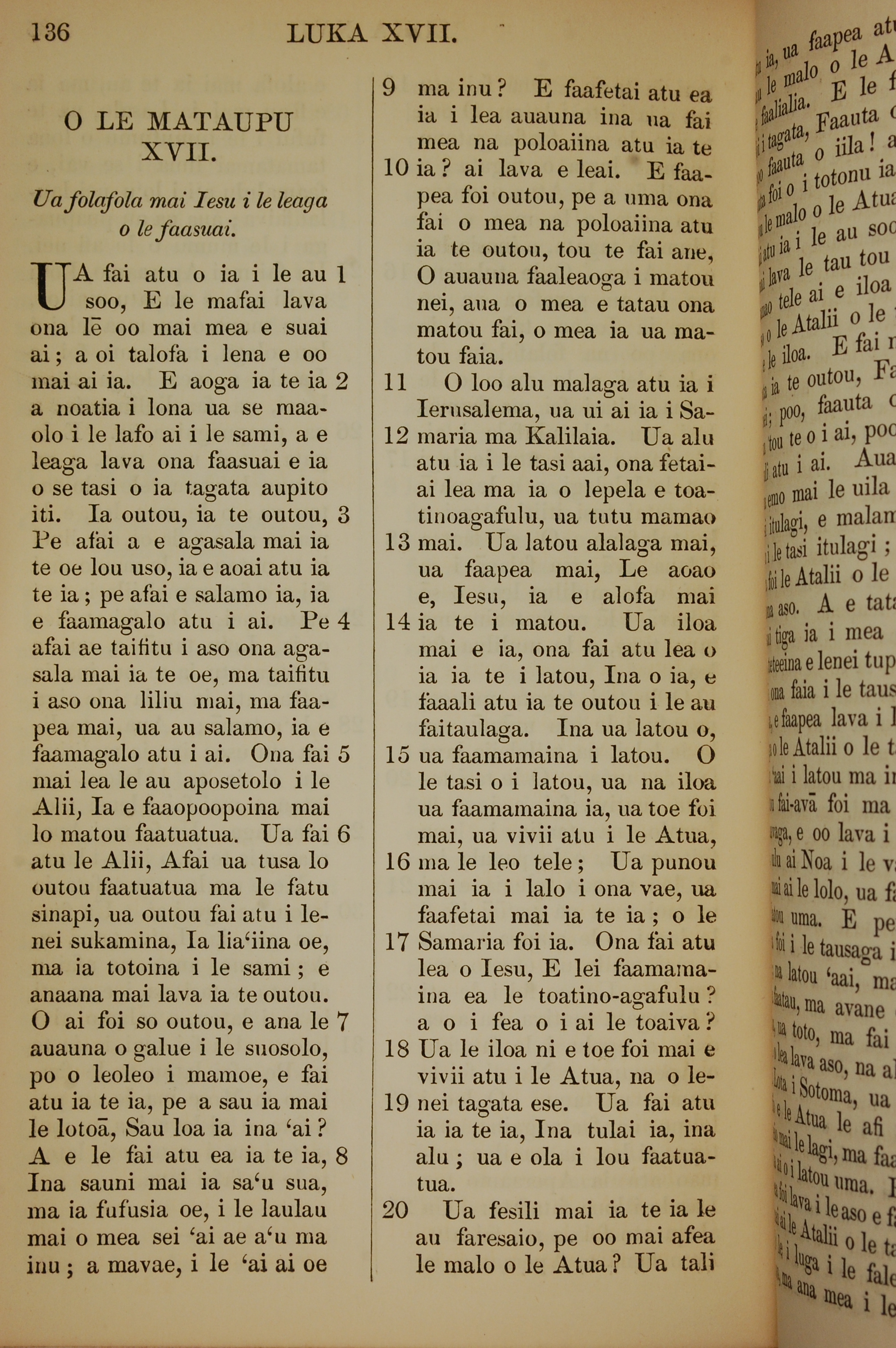 1849年薩摩亞語新約全書 路加福音 17 章 1 節到 17 章 20 節