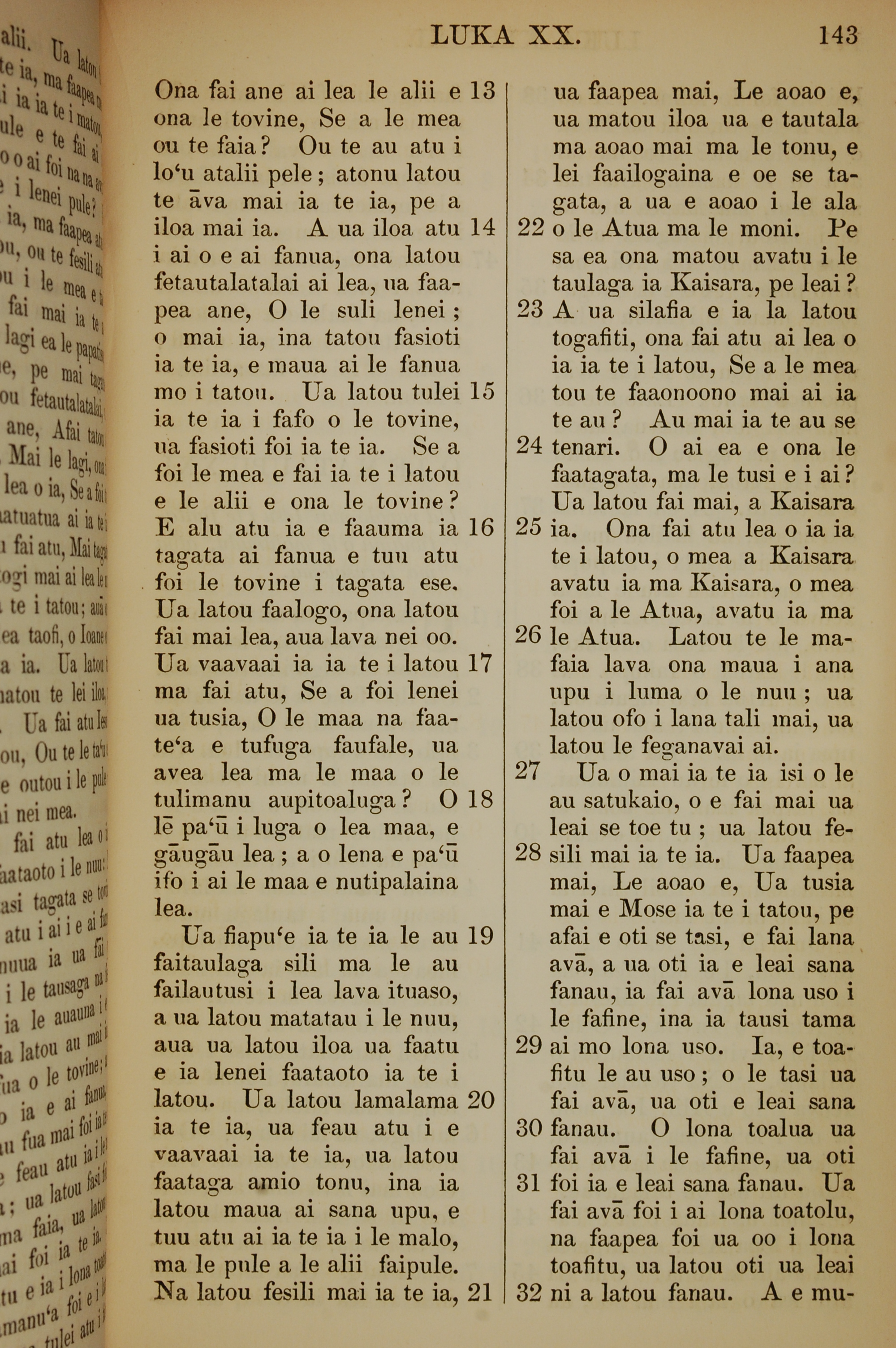 1849年薩摩亞語新約全書 路加福音 20 章 13 節到 20 章 32 節