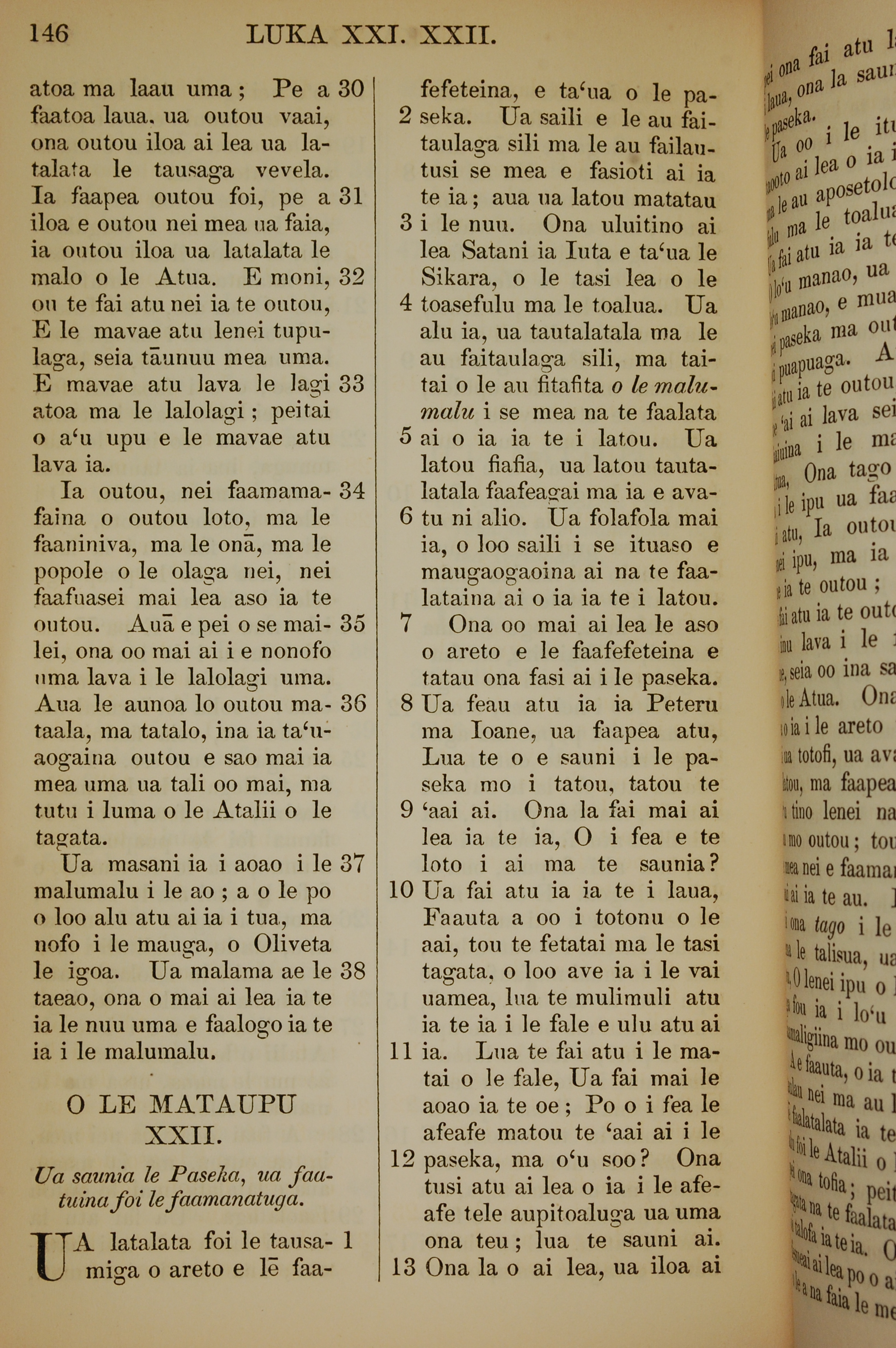 1849年薩摩亞語新約全書 路加福音 21 章 30 節到 22 章 13 節