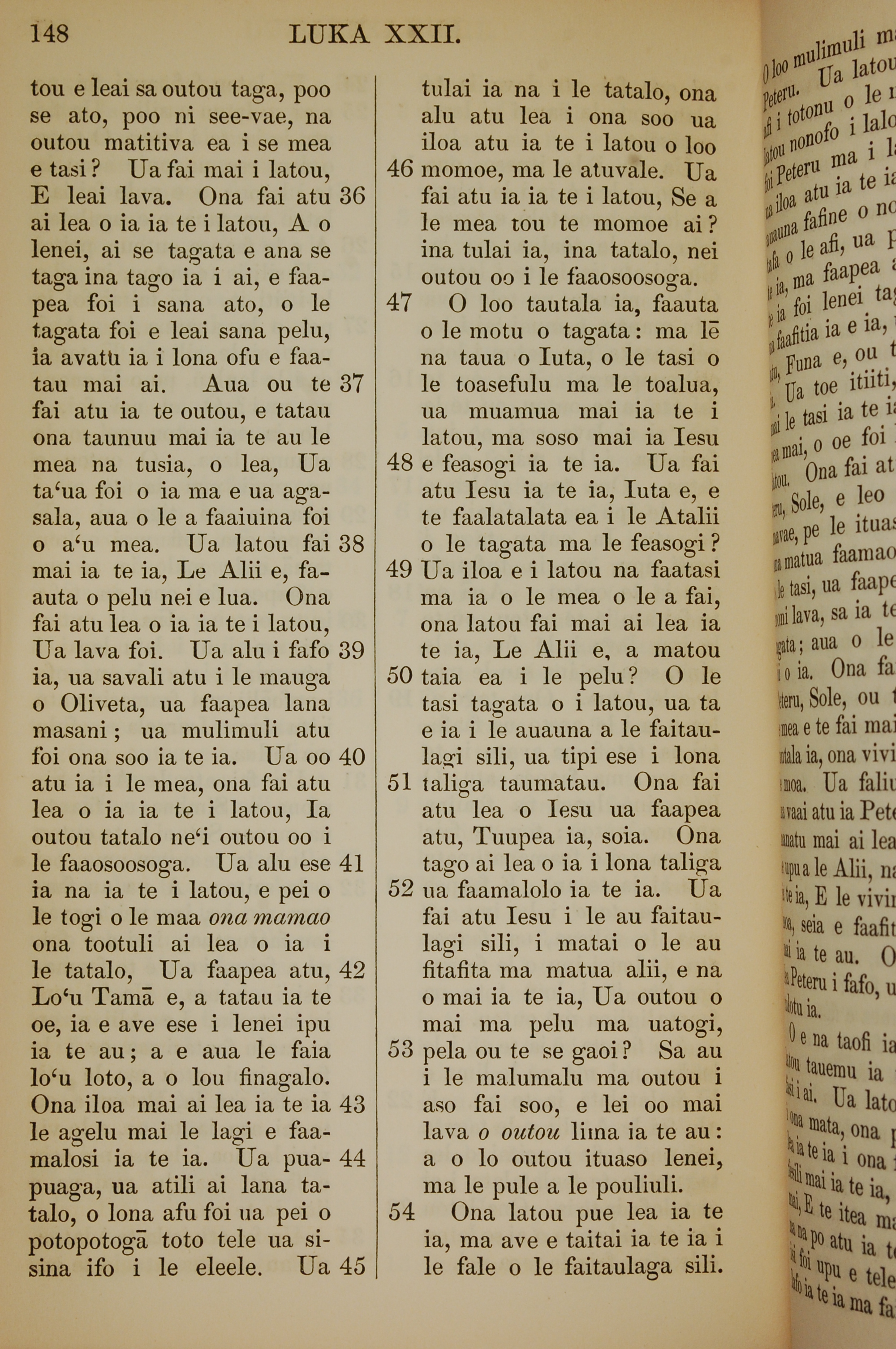 1849年薩摩亞語新約全書 路加福音 22 章 36 節到 22 章 54 節