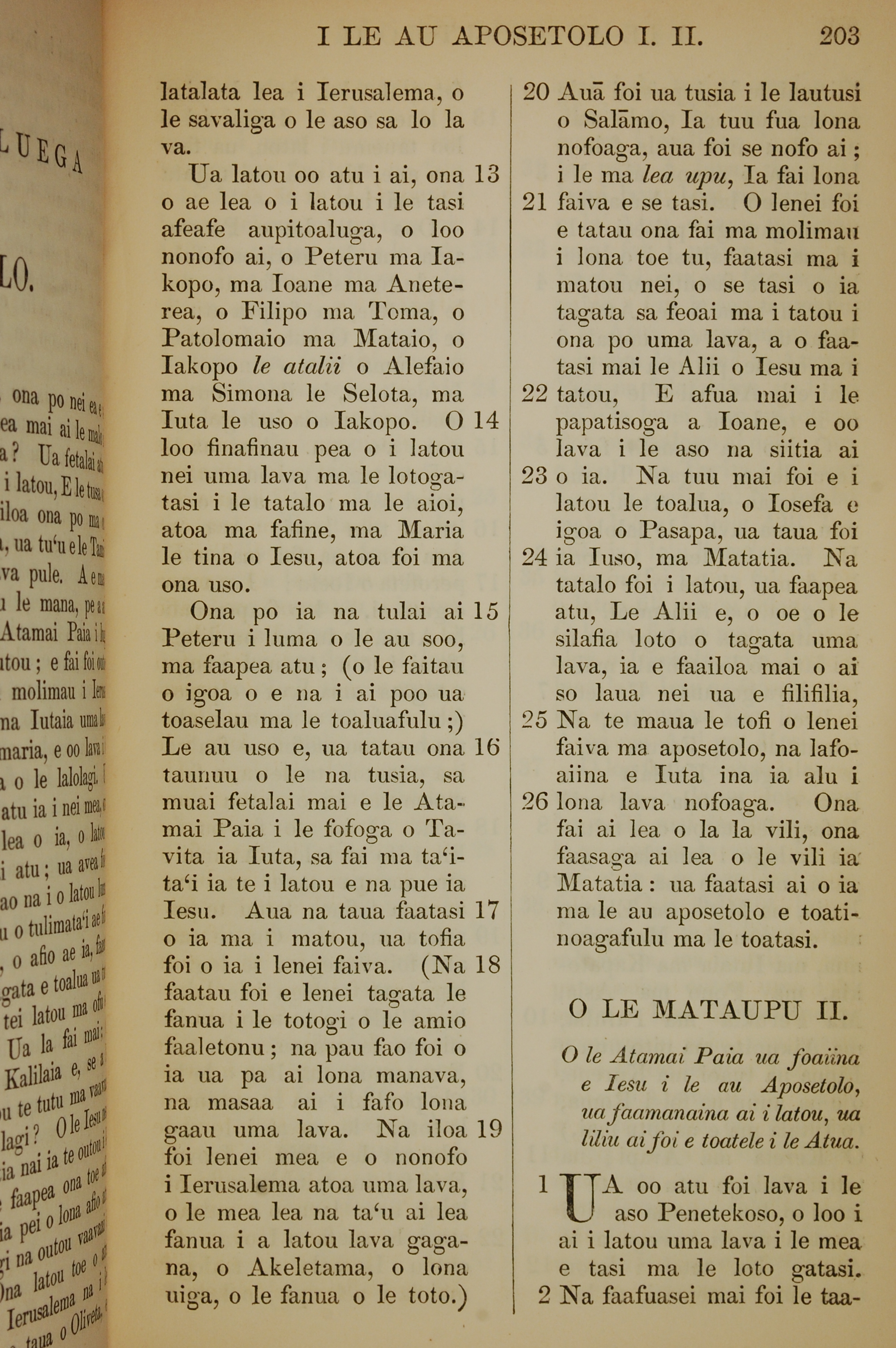 1849年薩摩亞語新約全書 使徒行傳 1 章 13 節到 2 章 2 節