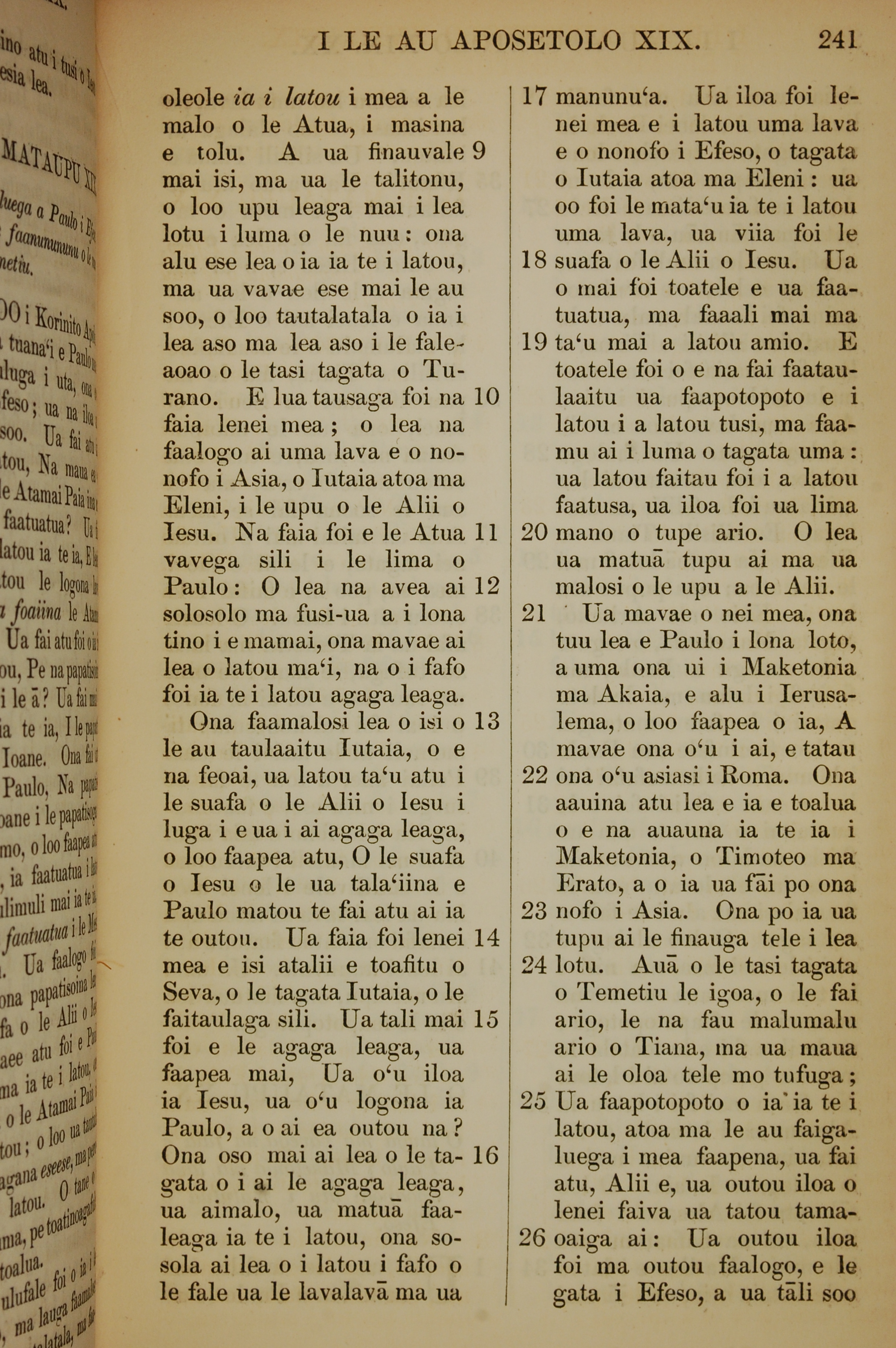 1849年薩摩亞語新約全書 使徒行傳 19 章 9 節到 19 章 26 節