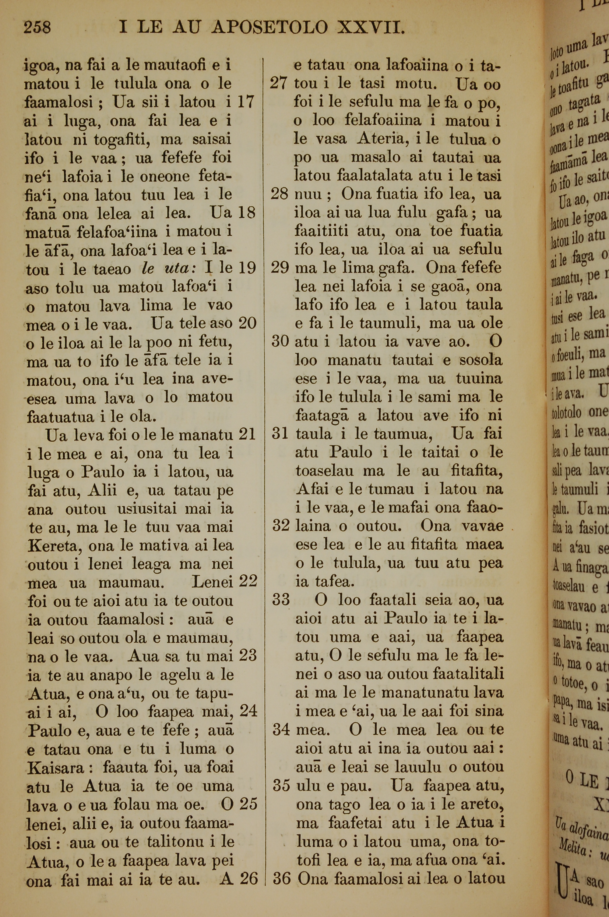 1849年薩摩亞語新約全書 使徒行傳 27 章 17 節到 27 章 36 節