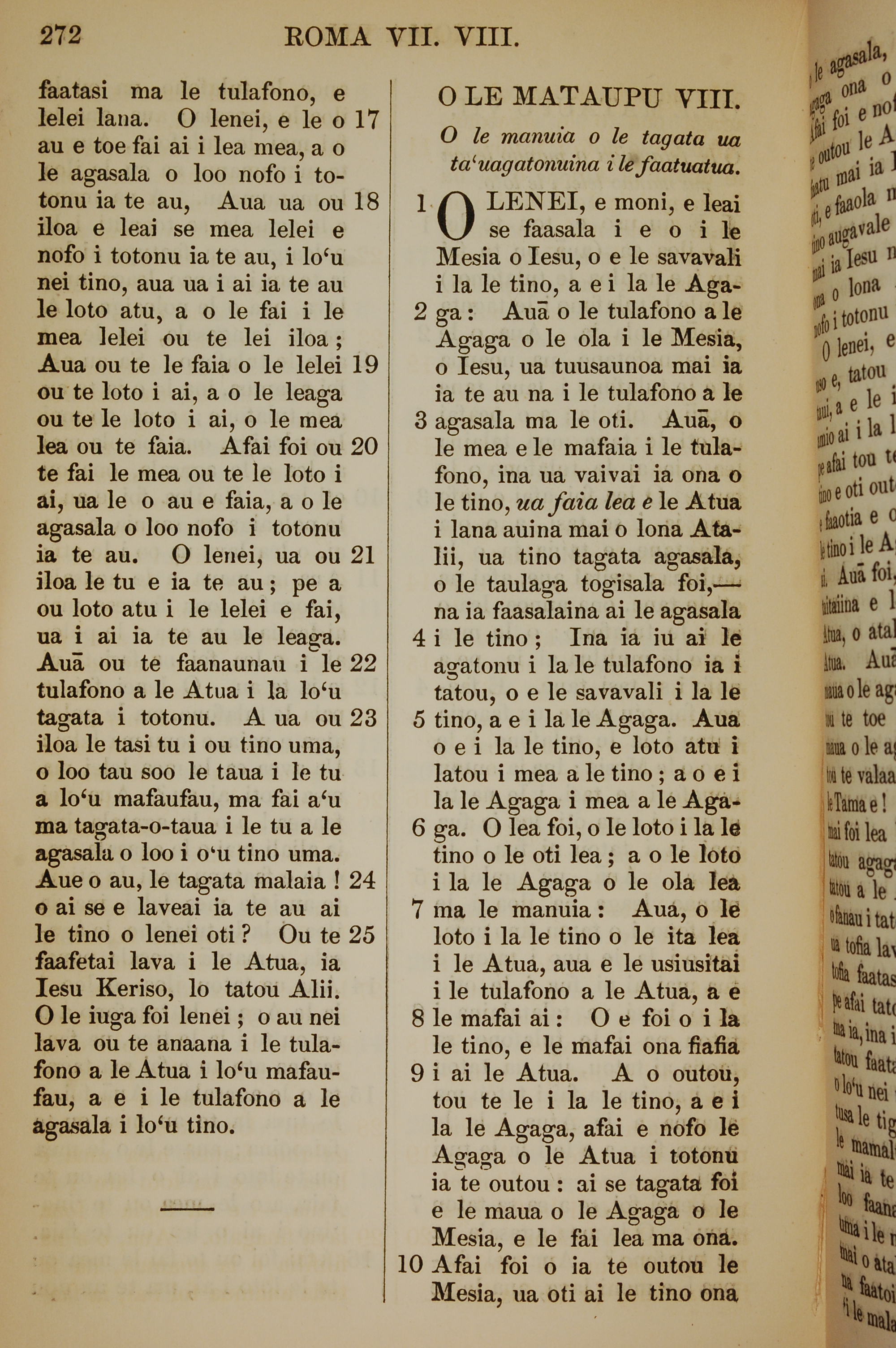 1849年薩摩亞語新約全書 羅馬書 7 章 17 節到 8 章 10 節