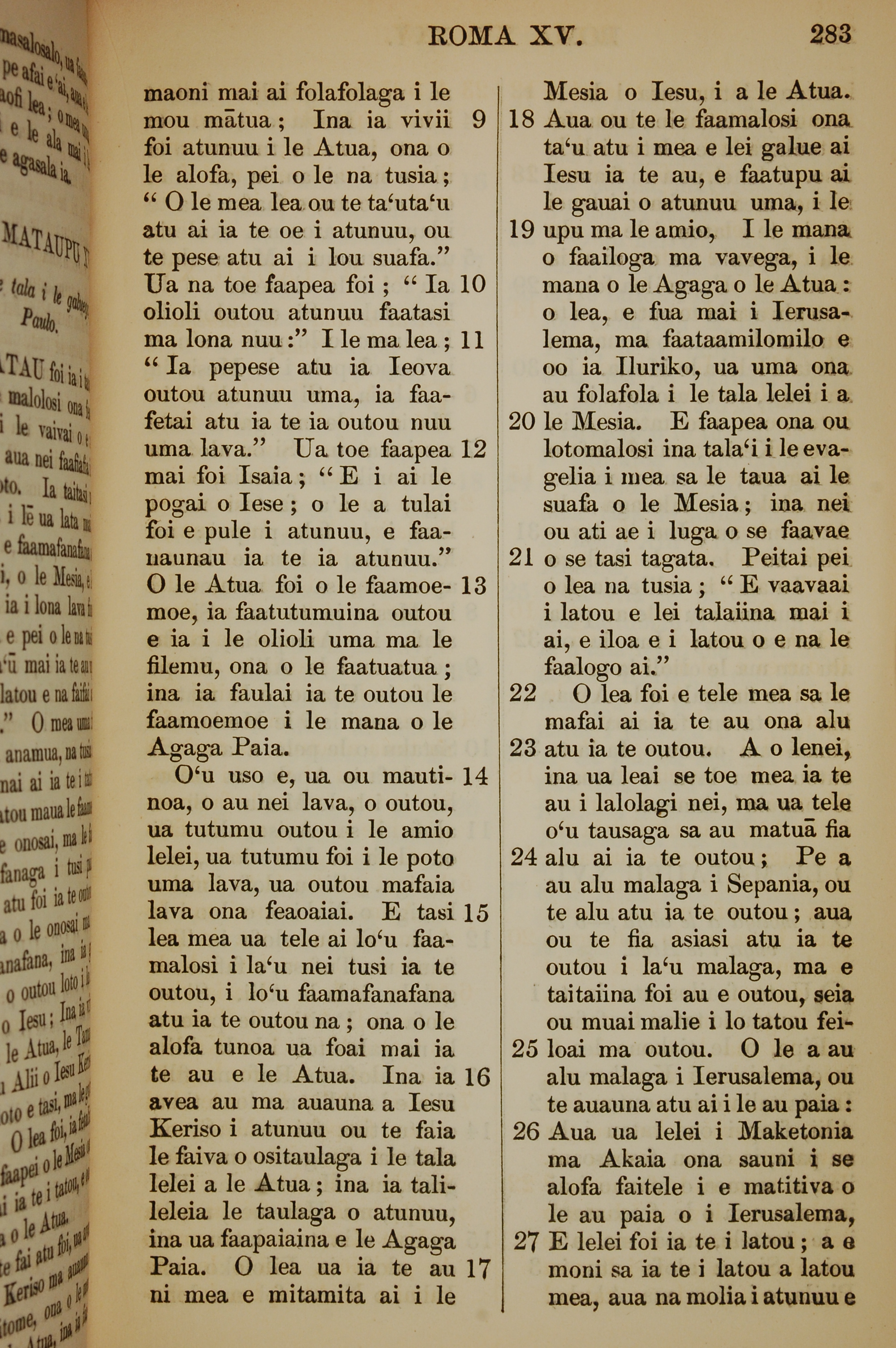 1849年薩摩亞語新約全書 羅馬書 15 章 9 節到 15 章 27 節