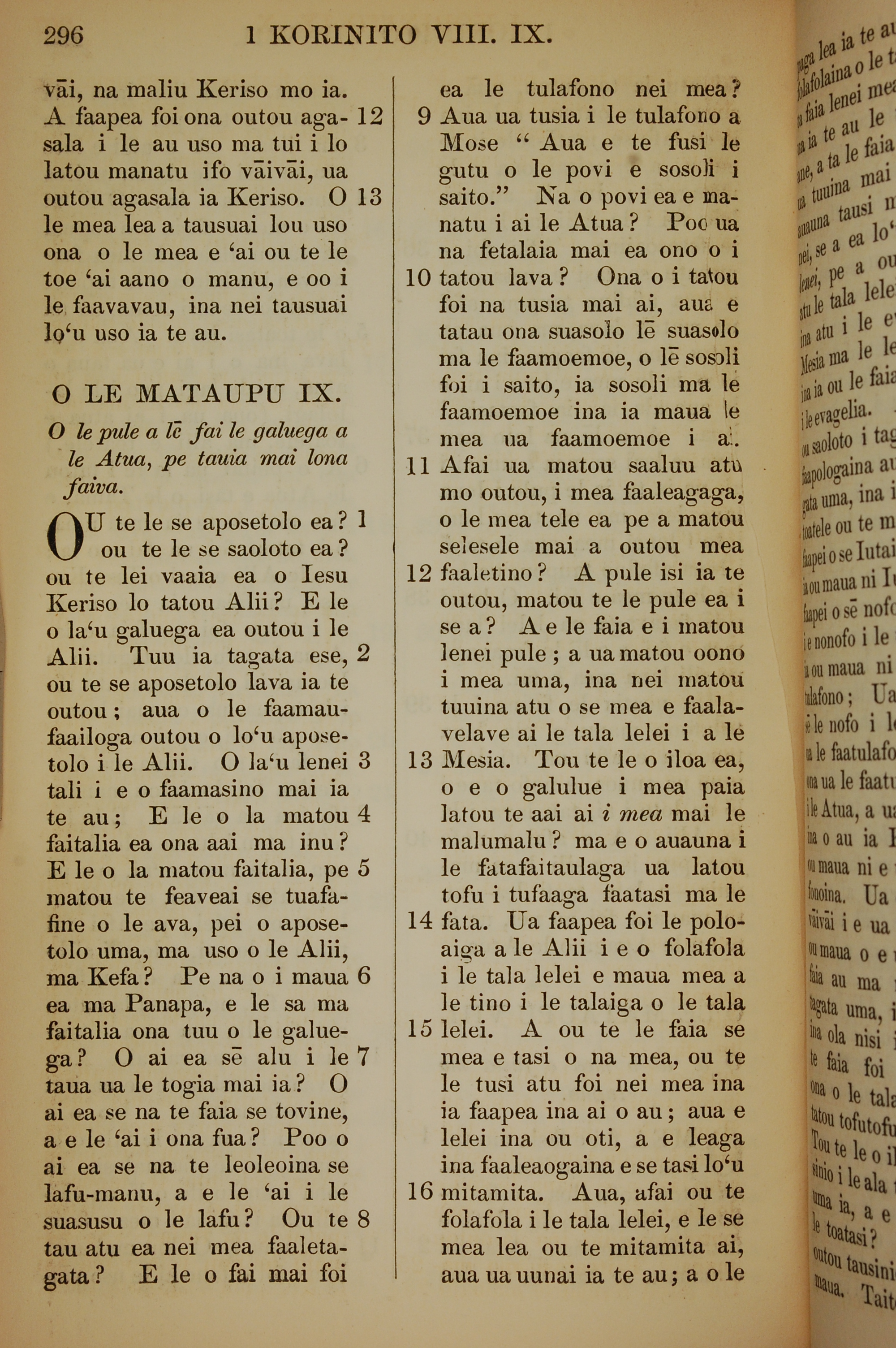 1849年薩摩亞語新約全書 哥林多前書 8 章 12 節到 9 章 16 節