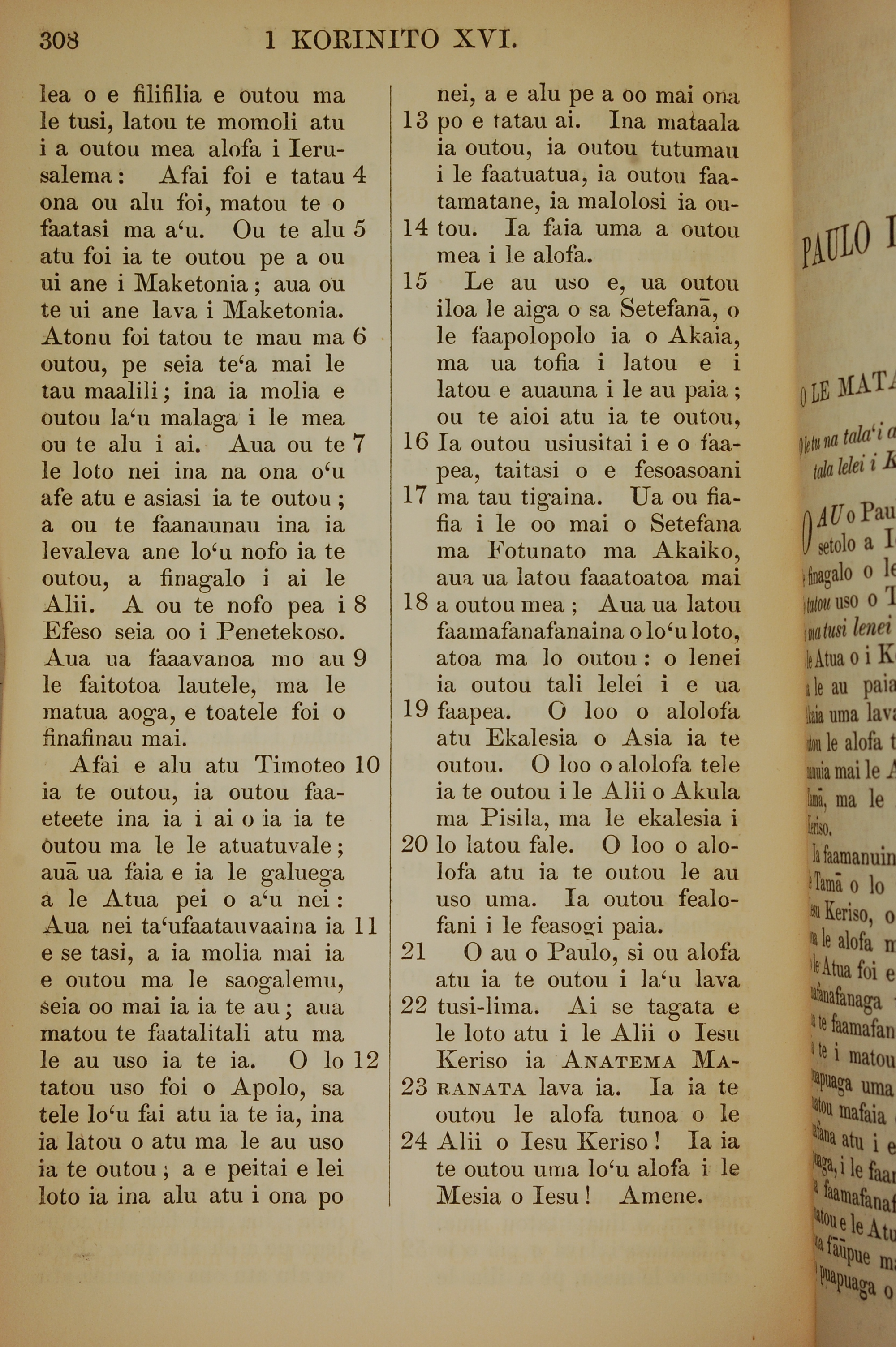 1849年薩摩亞語新約全書 哥林多前書 16 章 4 節到 16 章 24 節