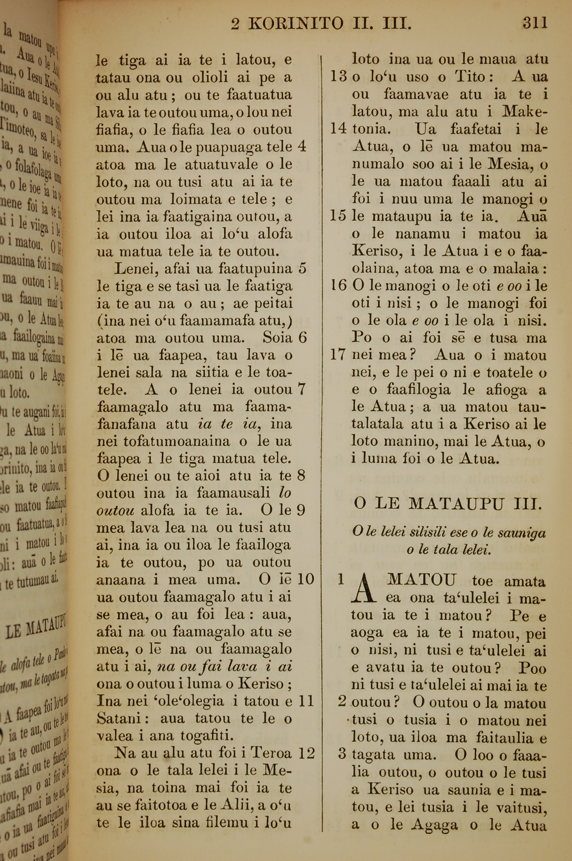 1849年薩摩亞語新約全書 哥林多後書 2 章 4 節到 3 章 3 節