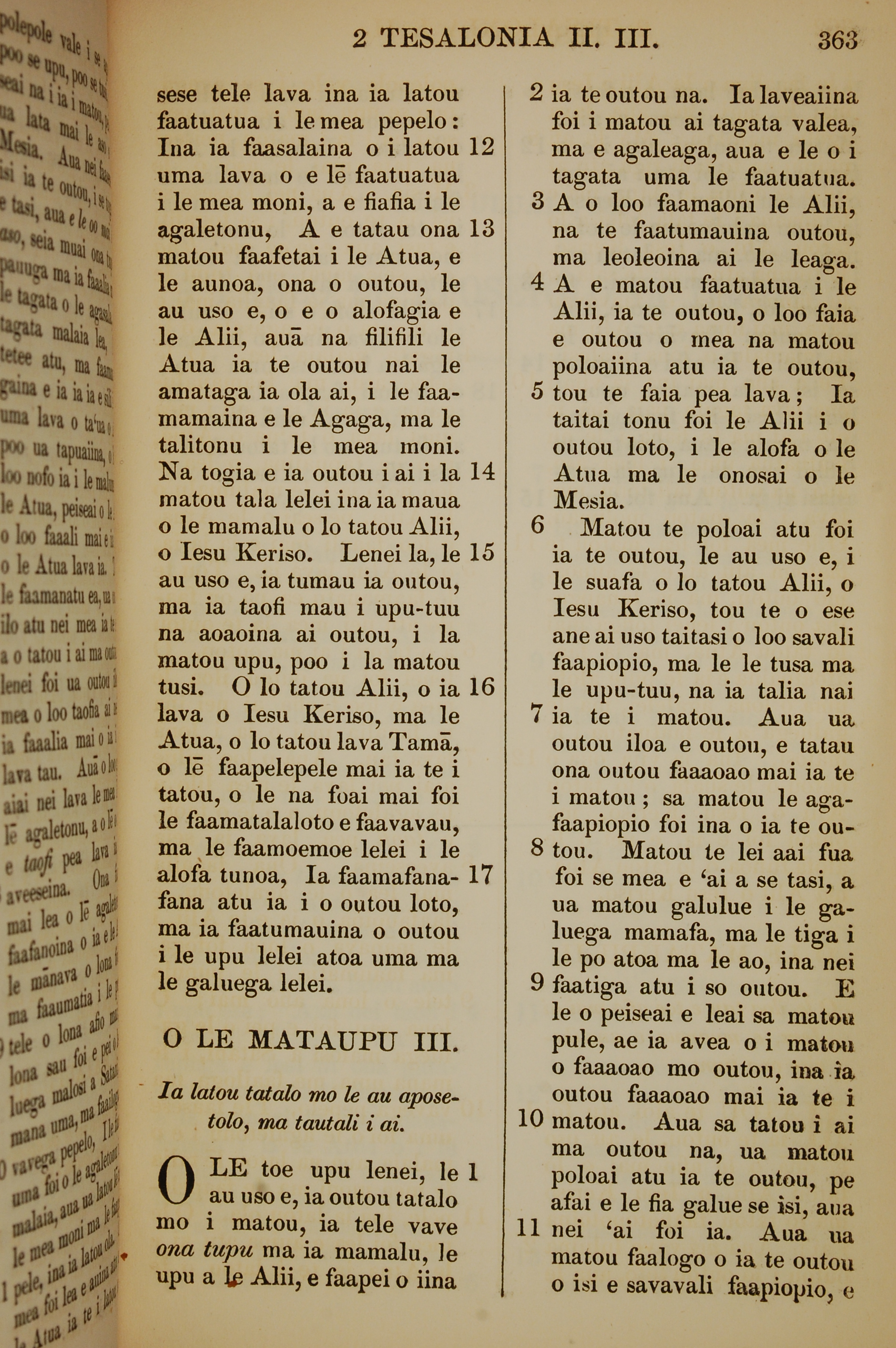 1849年薩摩亞語新約全書 帖撒羅尼迦後書 2 章 12 節到 3 章 11 節