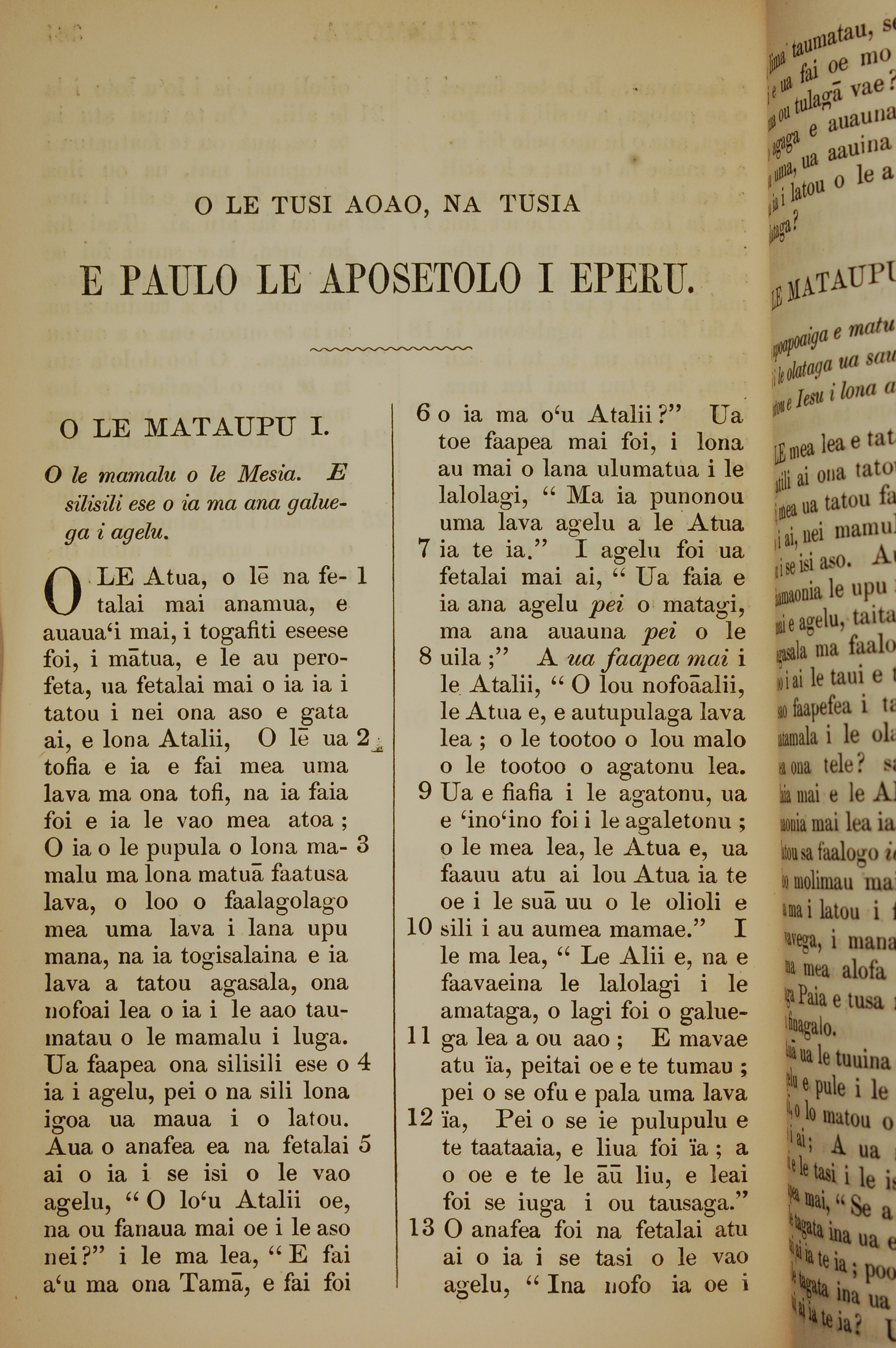 1849年薩摩亞語新約全書 希伯來書 1 章 1 節到 1 章 13 節