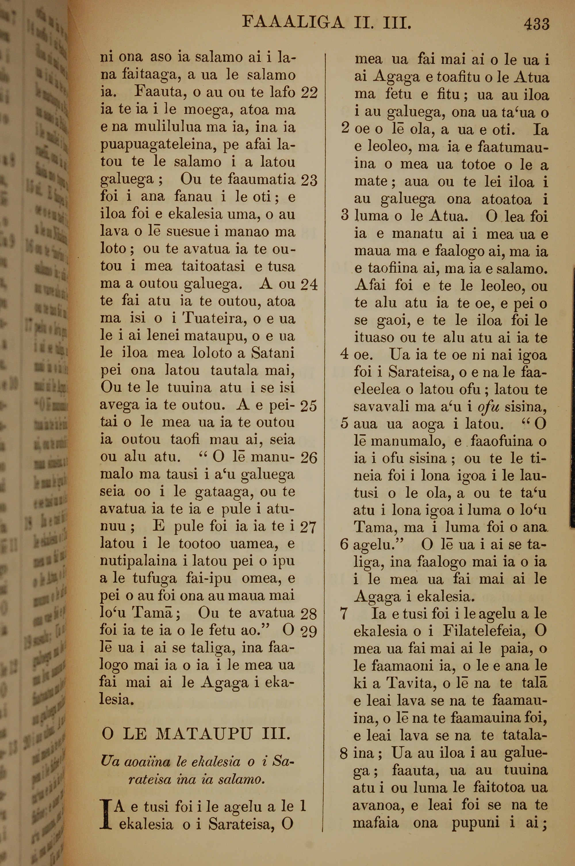 1849年薩摩亞語新約全書 啟示錄 2 章 22 節到 3 章 8 節