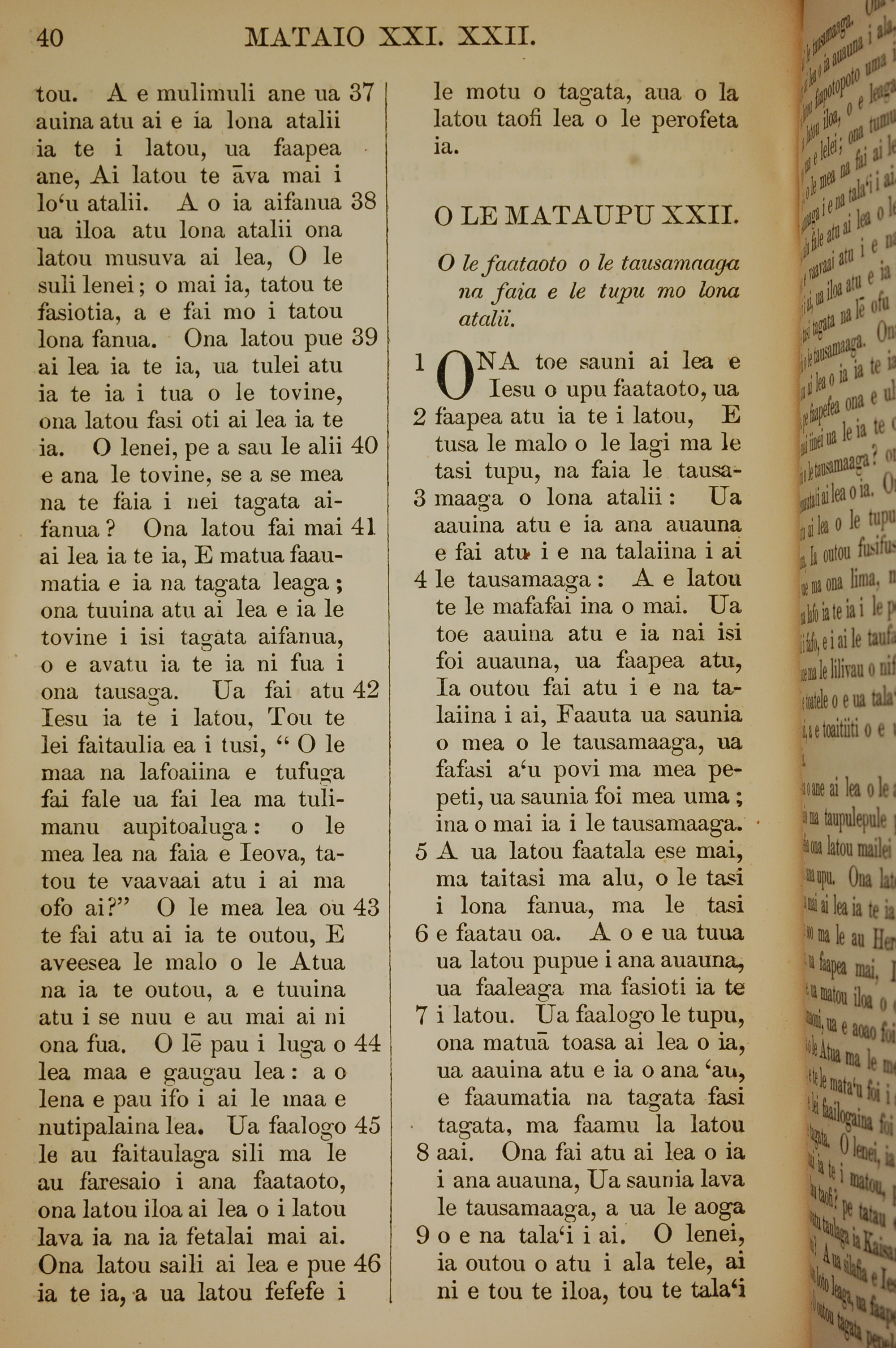 1849年薩摩亞語新約全書 馬太福音 21 章 37 節到 22 章 9 節