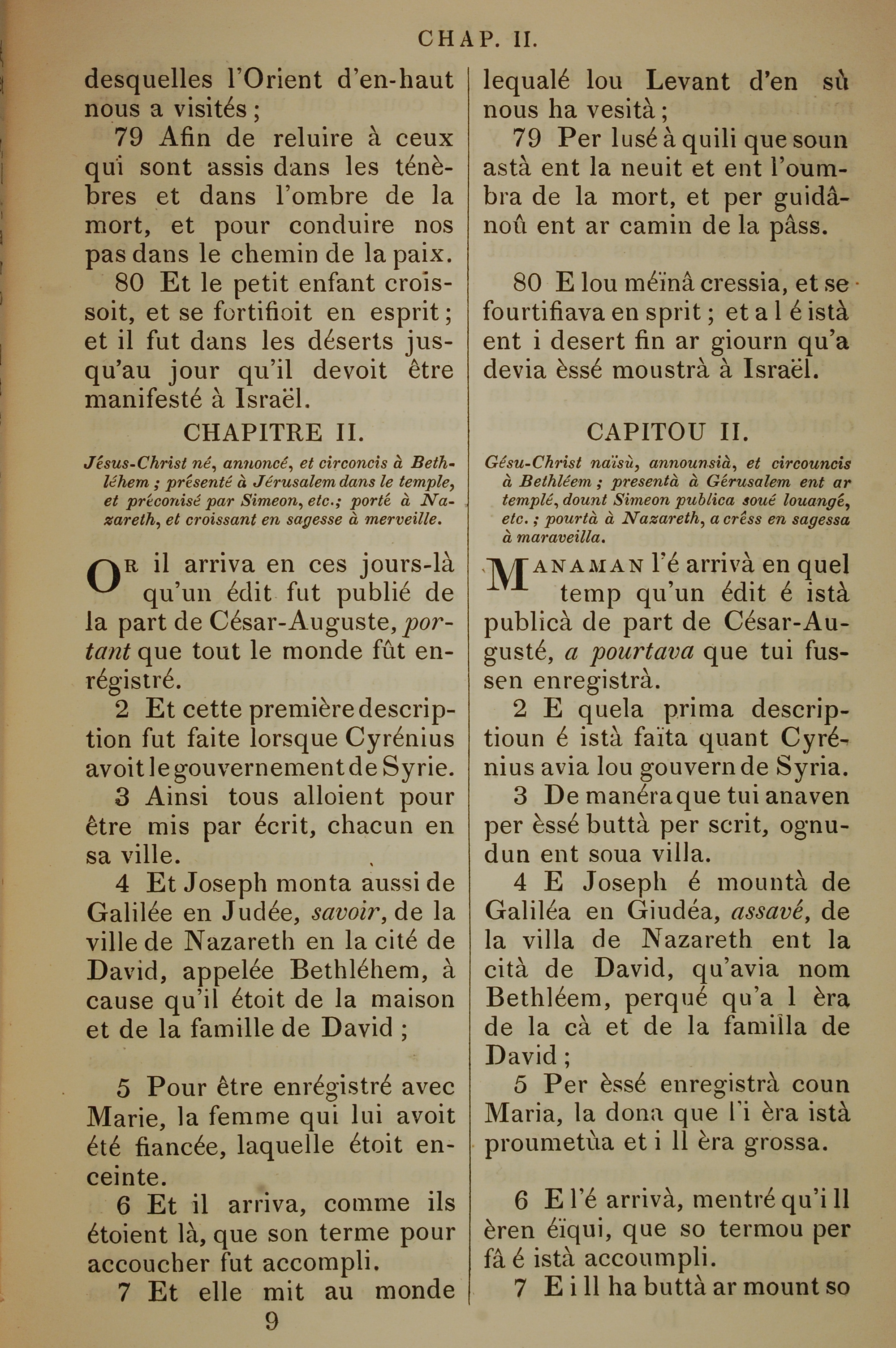 1832年法文聖經路加福音及約翰福音 路加福音 1 章 79 節到 2 章 7 節