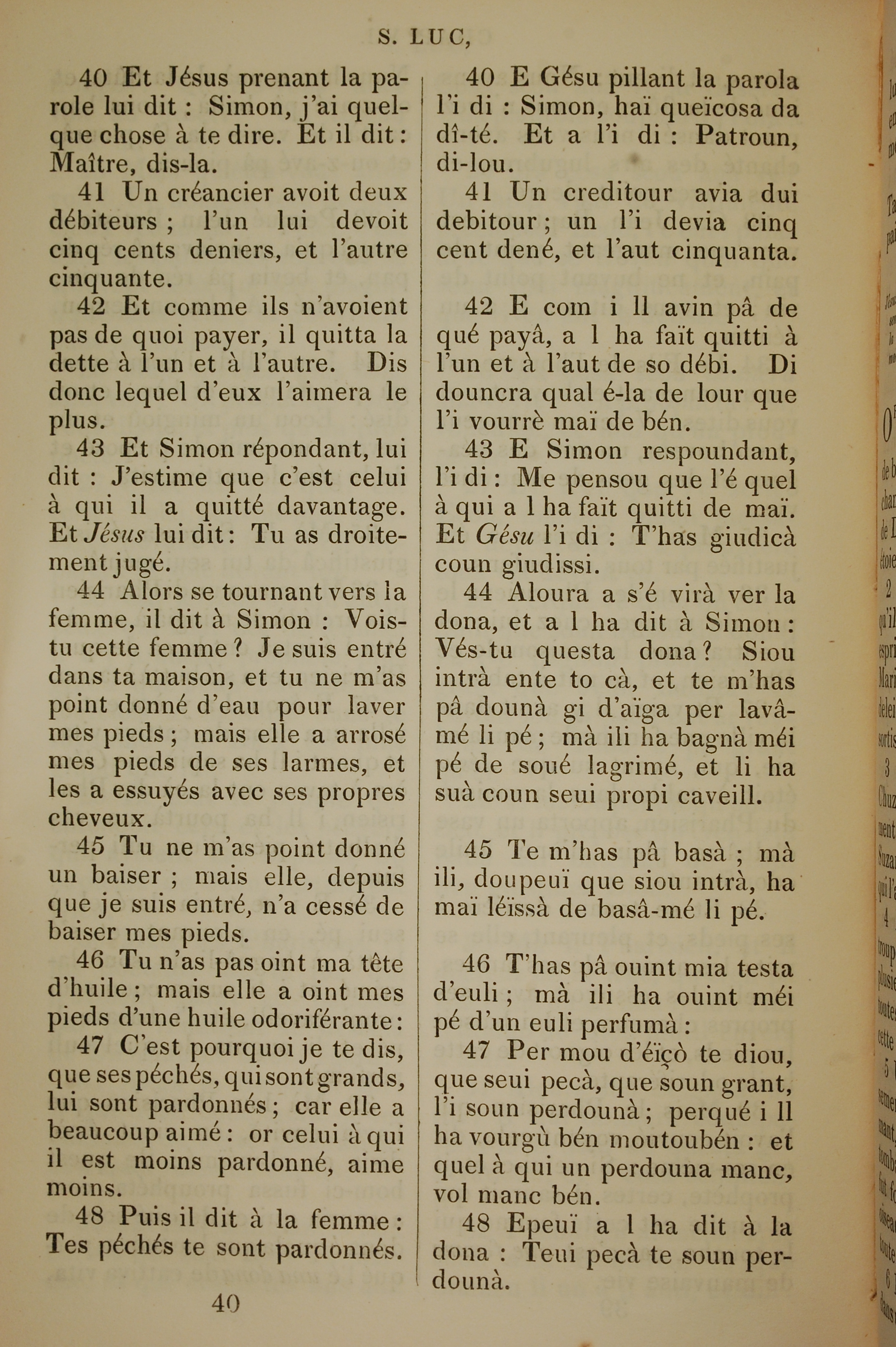 1832年法文聖經路加福音及約翰福音 路加福音 7 章 40 節到 7 章 48 節