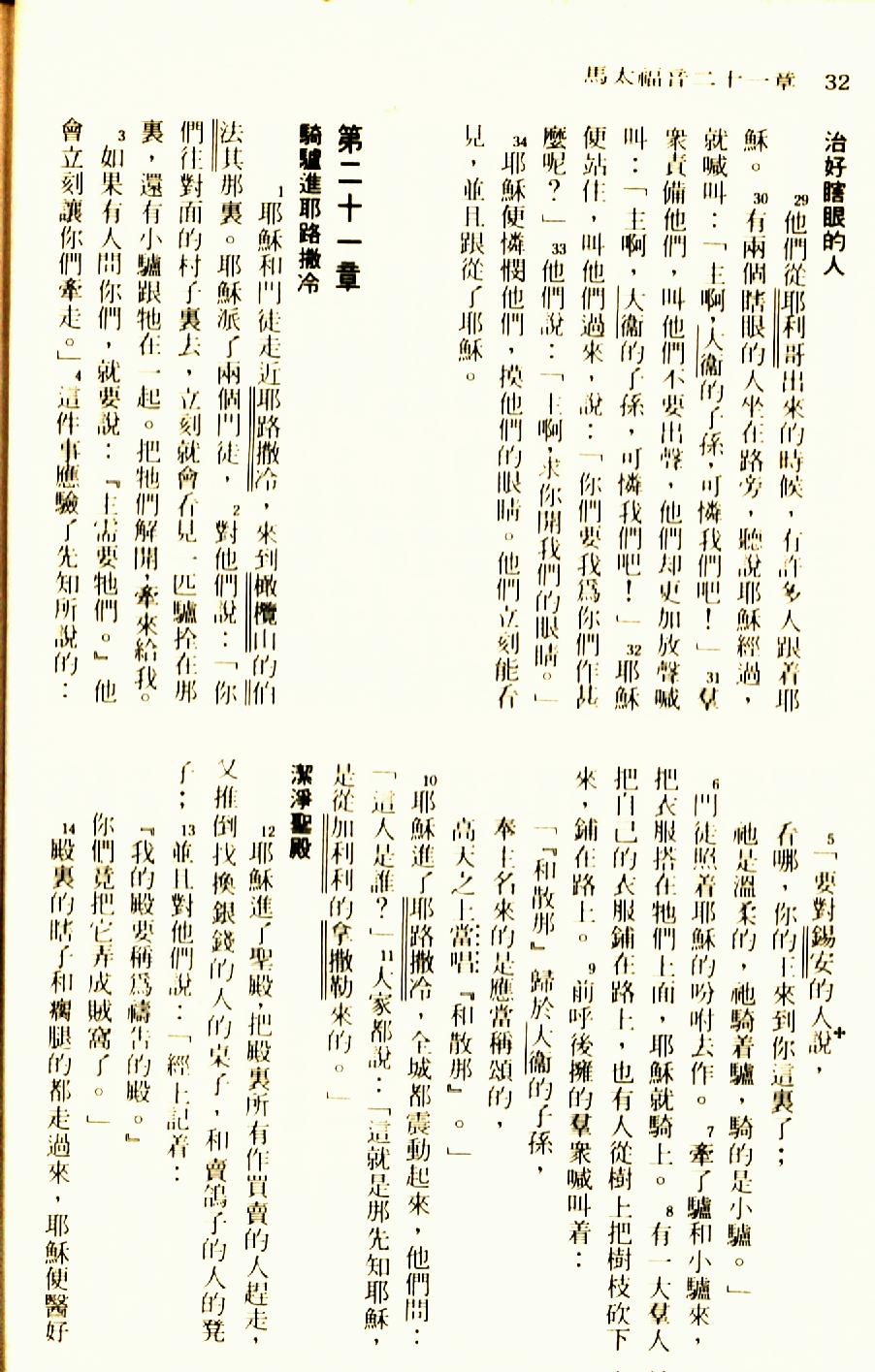 1976年聖經新譯本新約 馬太福音 20 章 29 節到 21 章 14 節