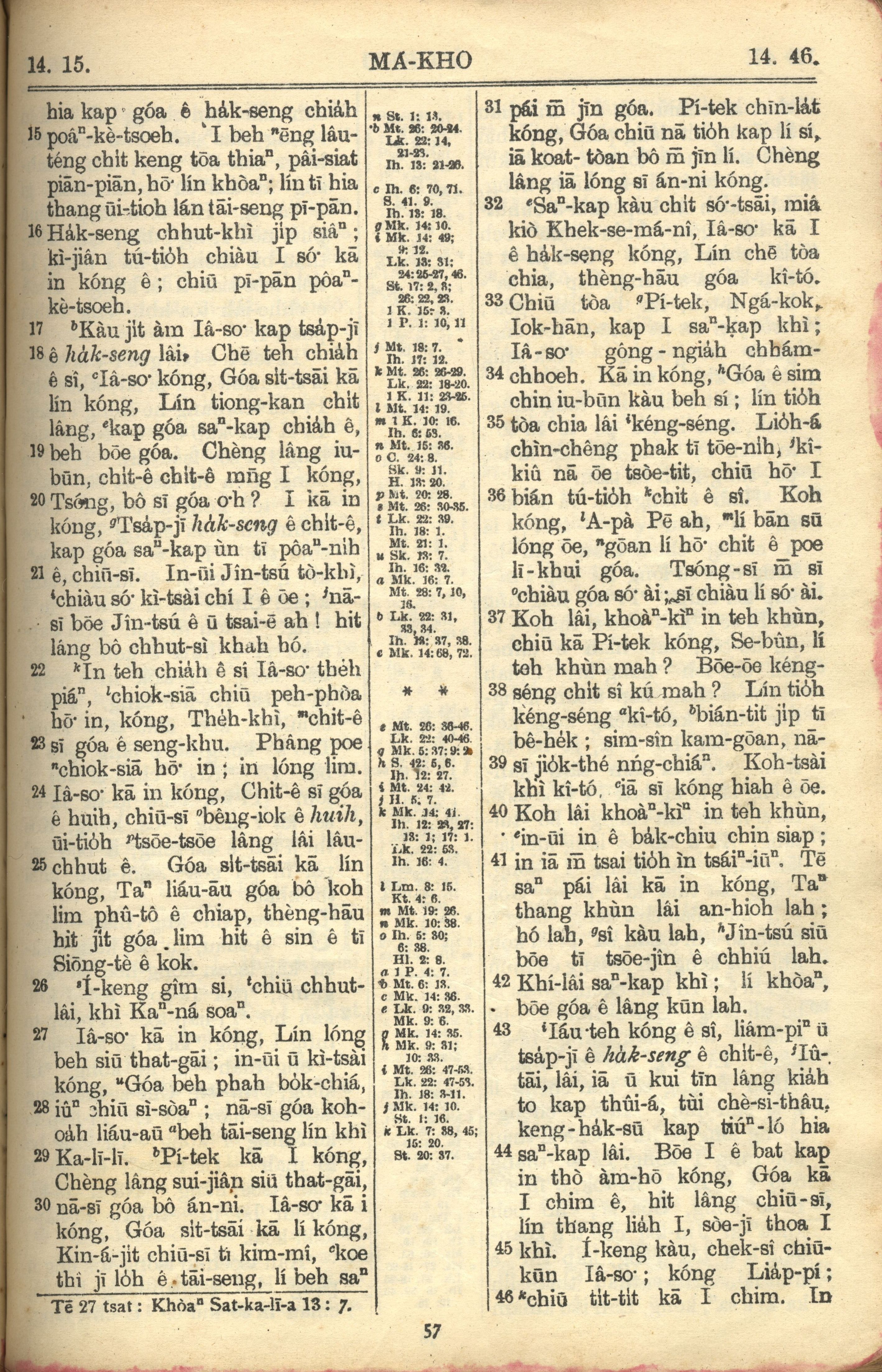 1957年巴克禮全羅台語聖經串珠版 馬可福音 14 章 15 節到 14 章 46 節