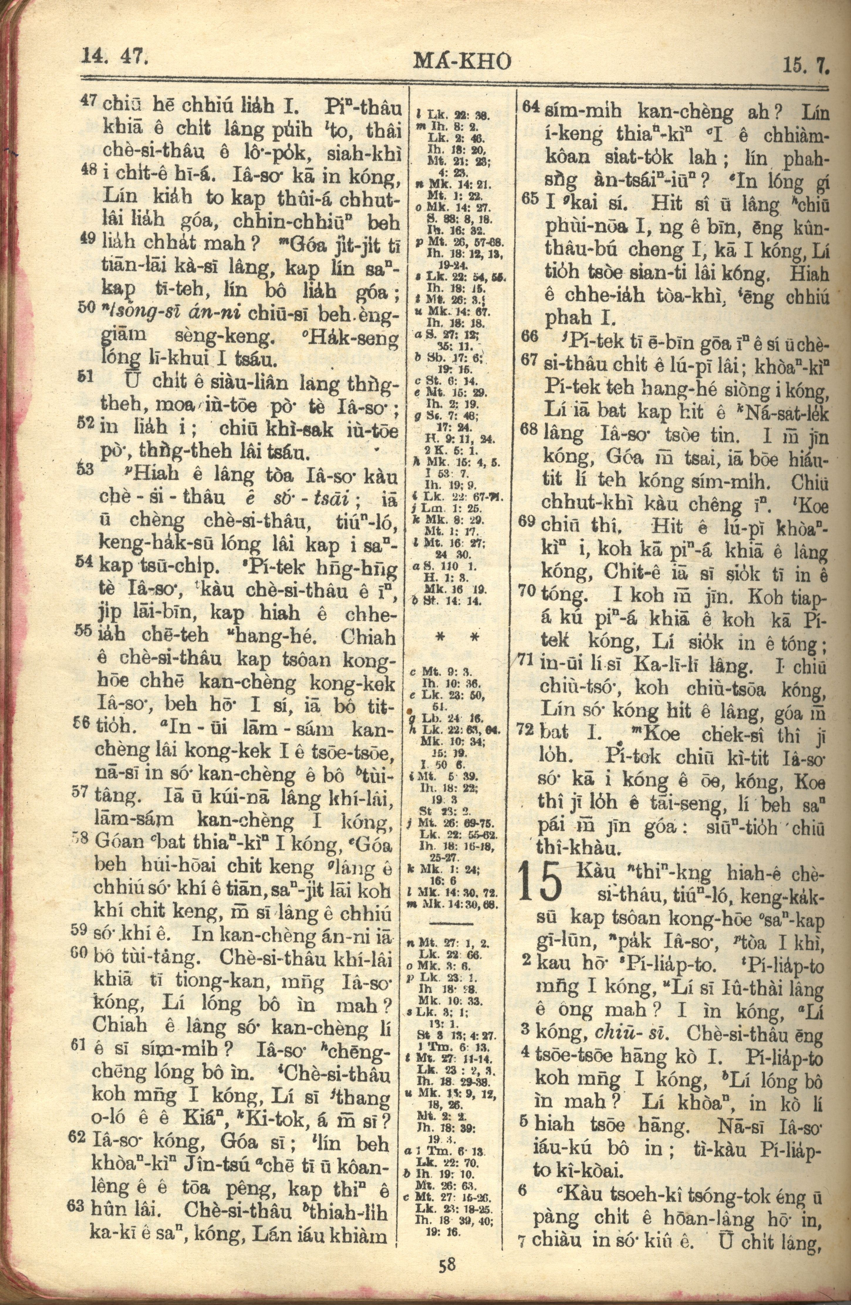 1957年巴克禮全羅台語聖經串珠版 馬可福音 14 章 47 節到 15 章 7 節
