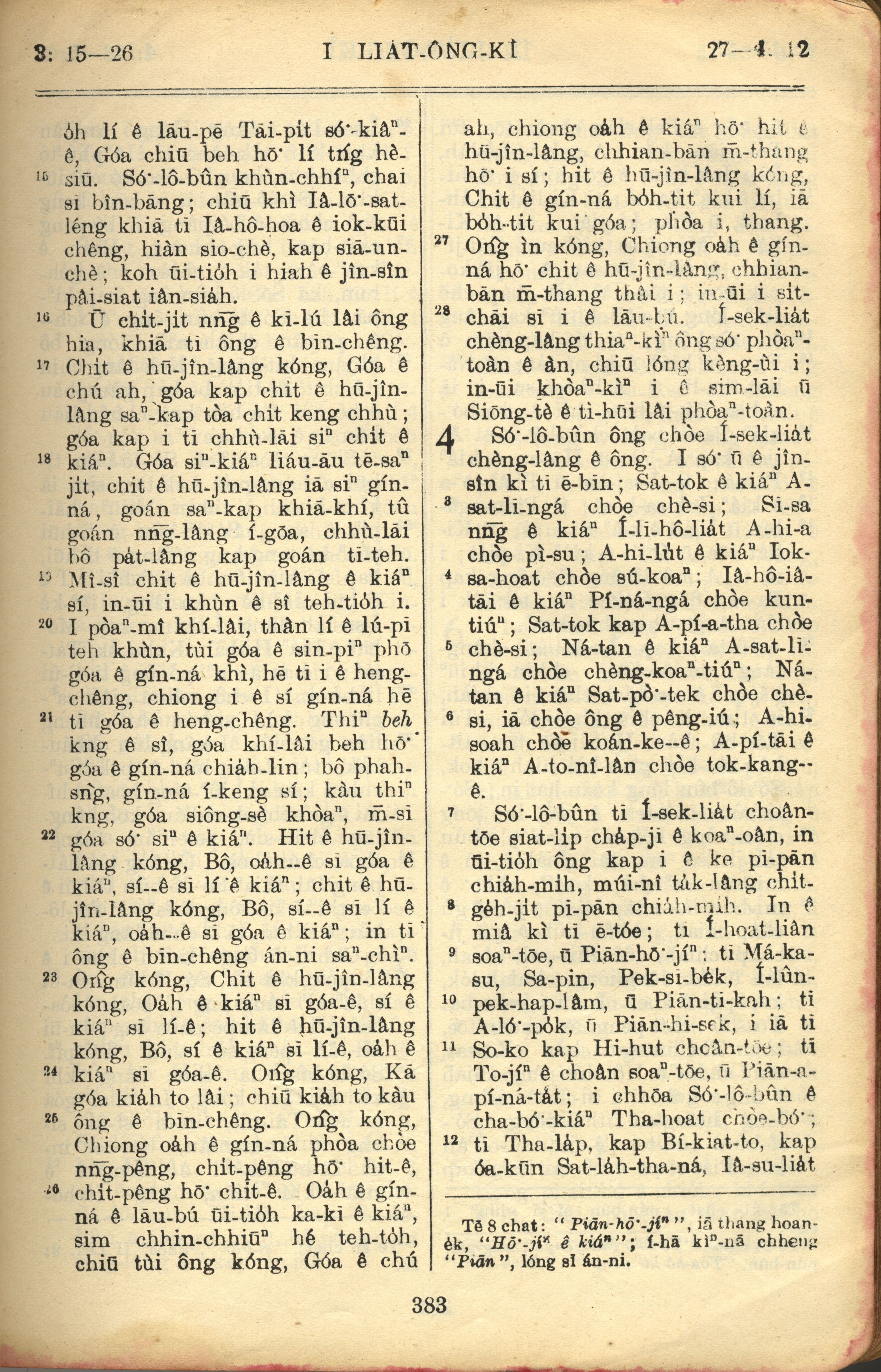 1957年巴克禮全羅台語聖經串珠版 列王紀上 3 章 15 節到 4 章 12 節