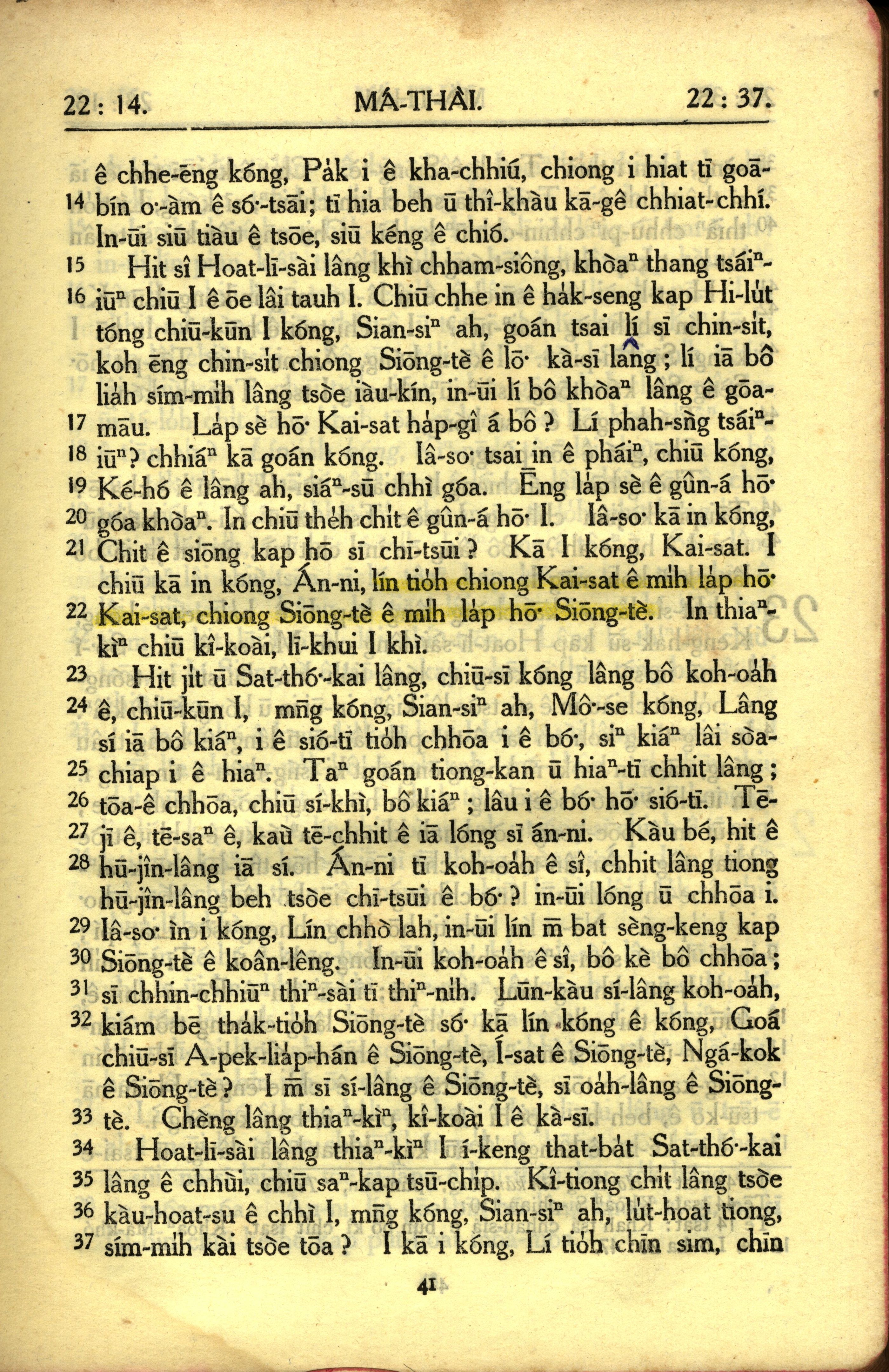 1950年教羅新約全書 馬太福音 22 章 14 節到 22 章 37 節
