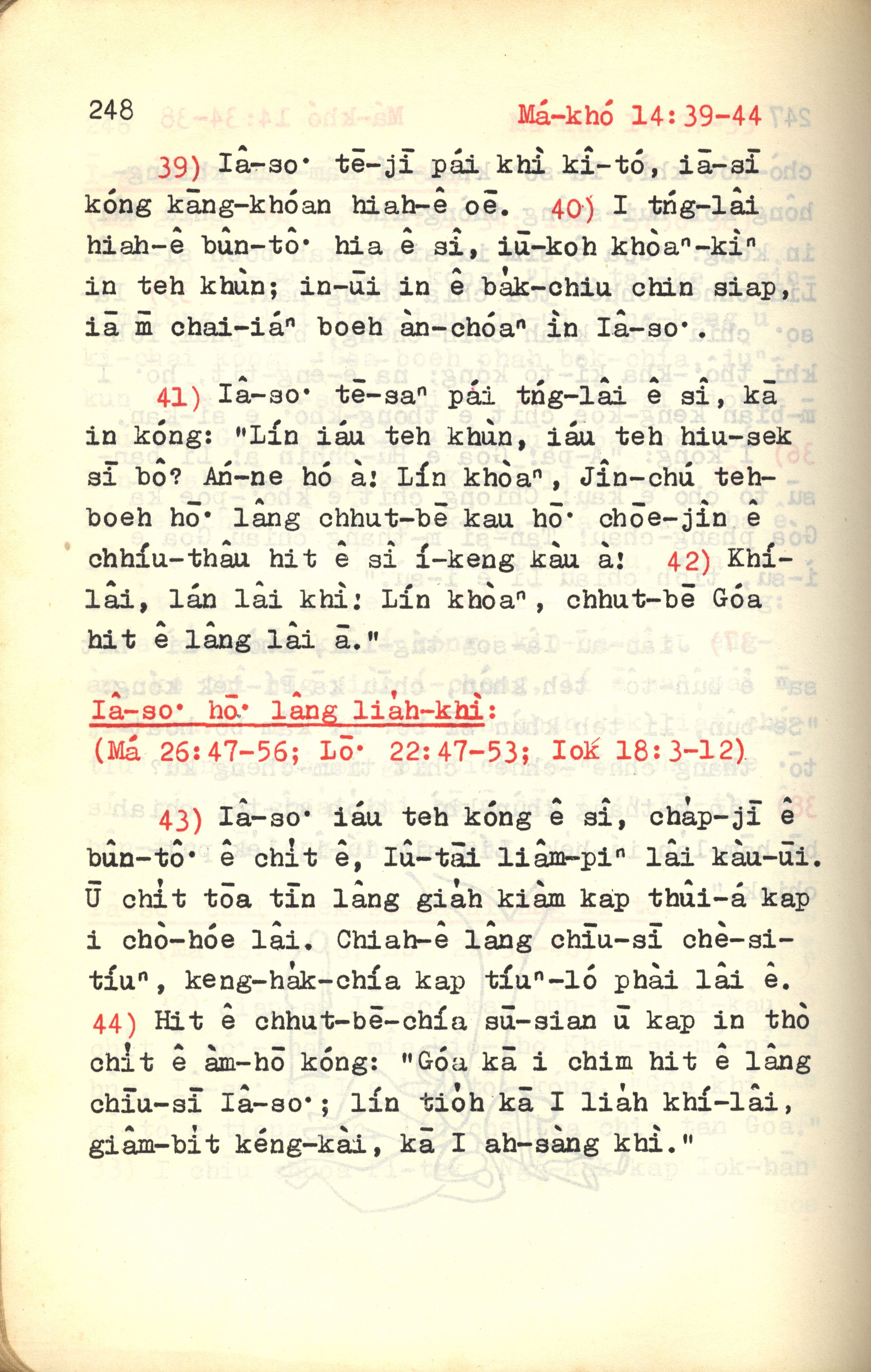 1972年新約紅皮聖經 馬可福音 14 章 39 節到 14 章 44 節