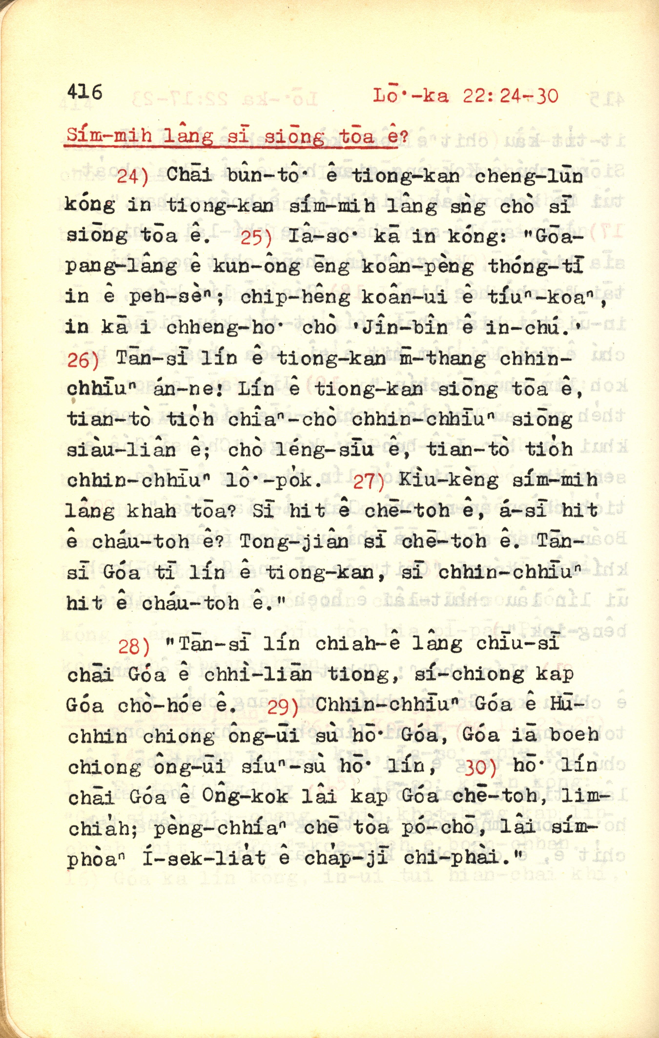 1972年新約紅皮聖經 路加福音 22 章 24 節到 22 章 30 節