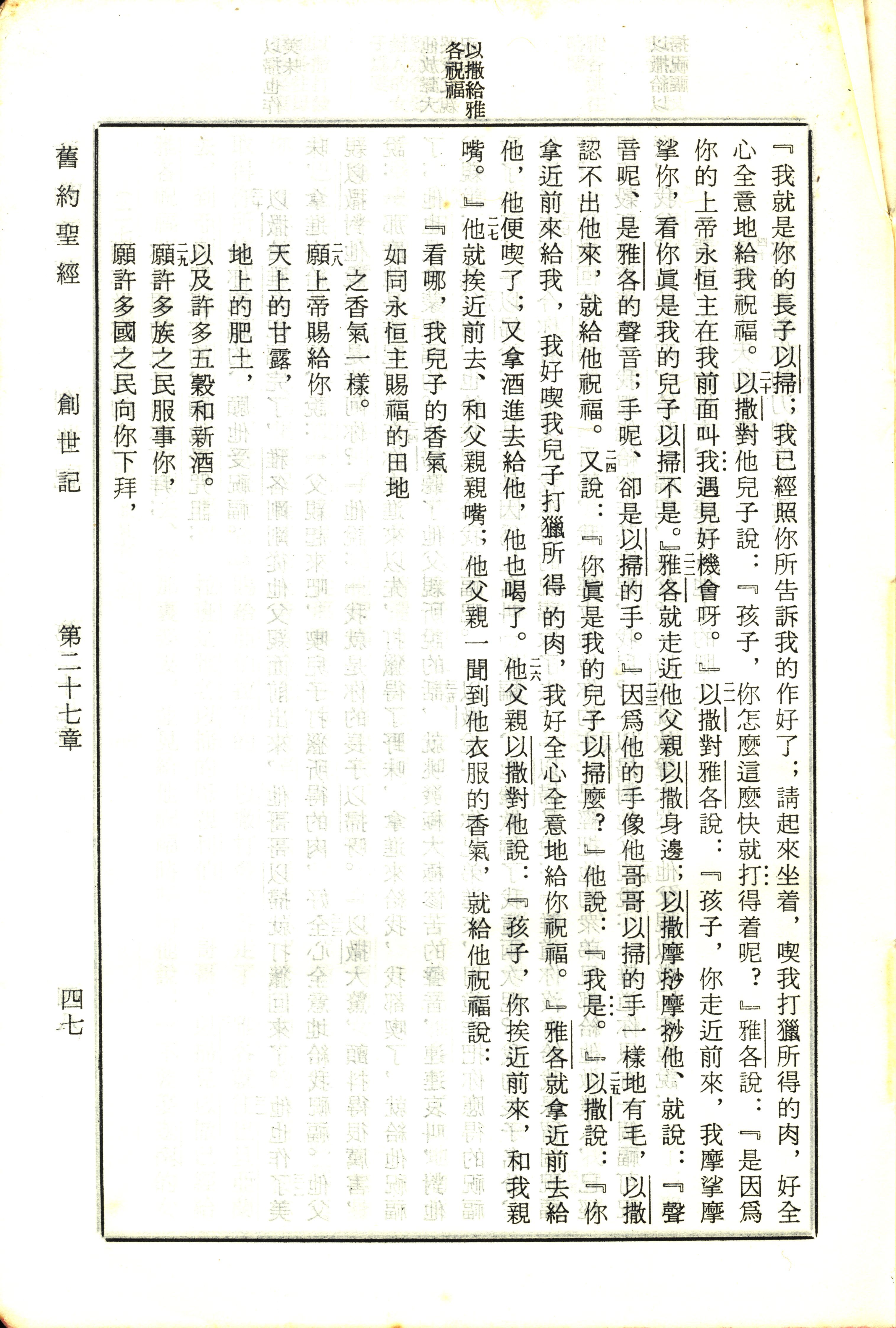 1970年新舊約全書(呂振中譯本) 創世記 27 章 20 節到 27 章 29 節