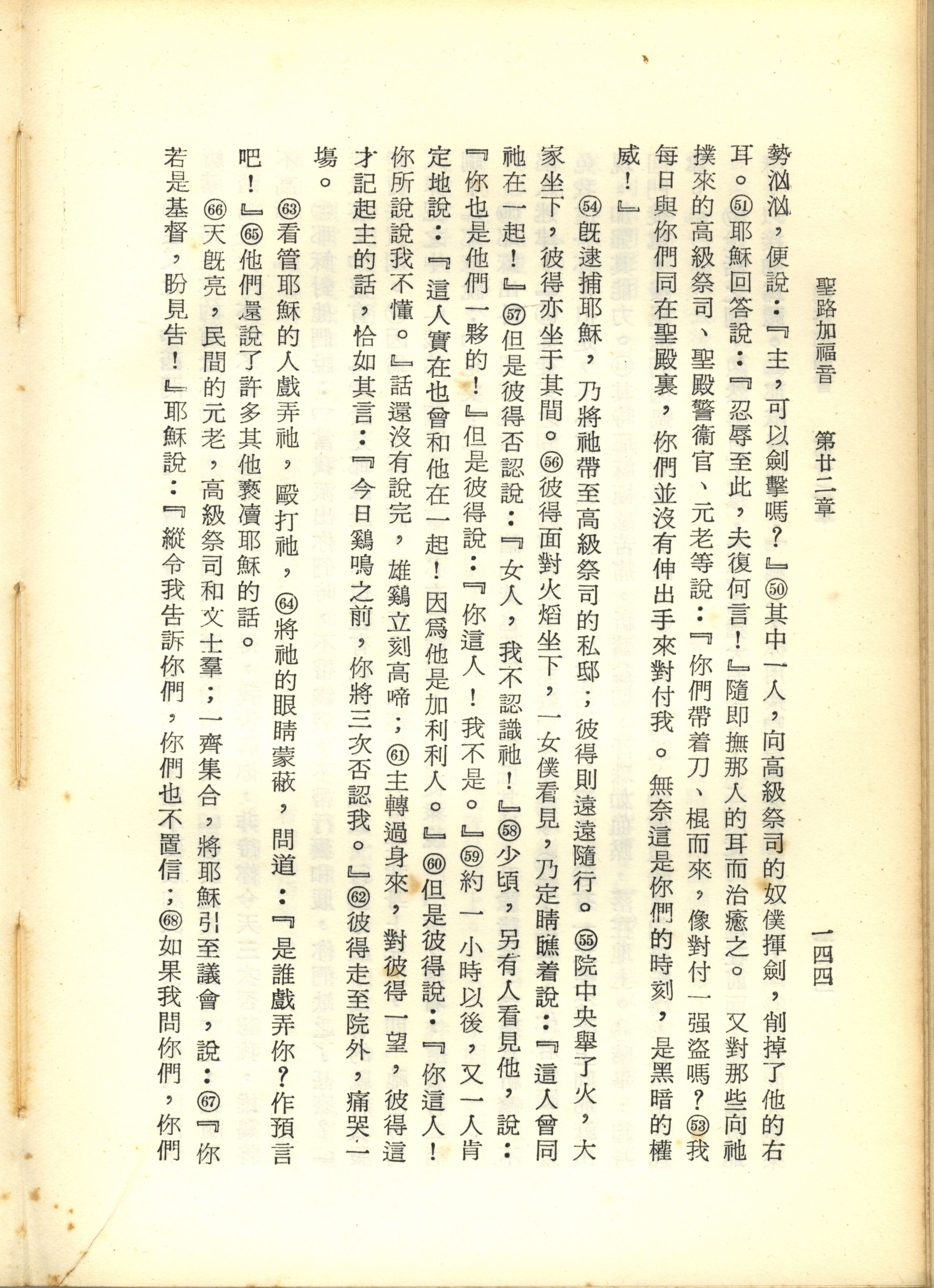 1967年新譯新約全集 路加福音 22 章 50 節到 22 章 68 節