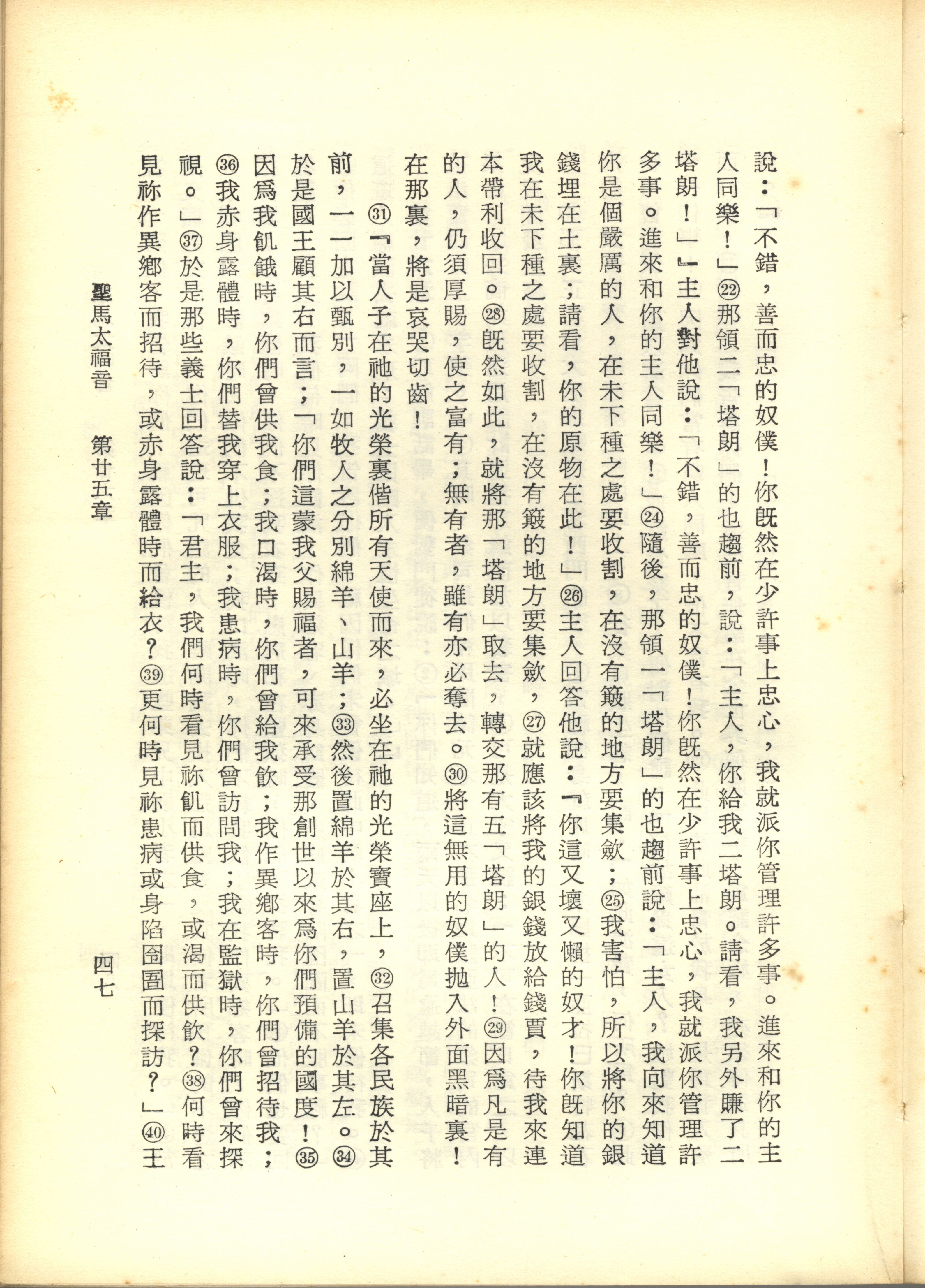 1967年新譯新約全集 馬太福音 25 章 22 節到 25 章 40 節