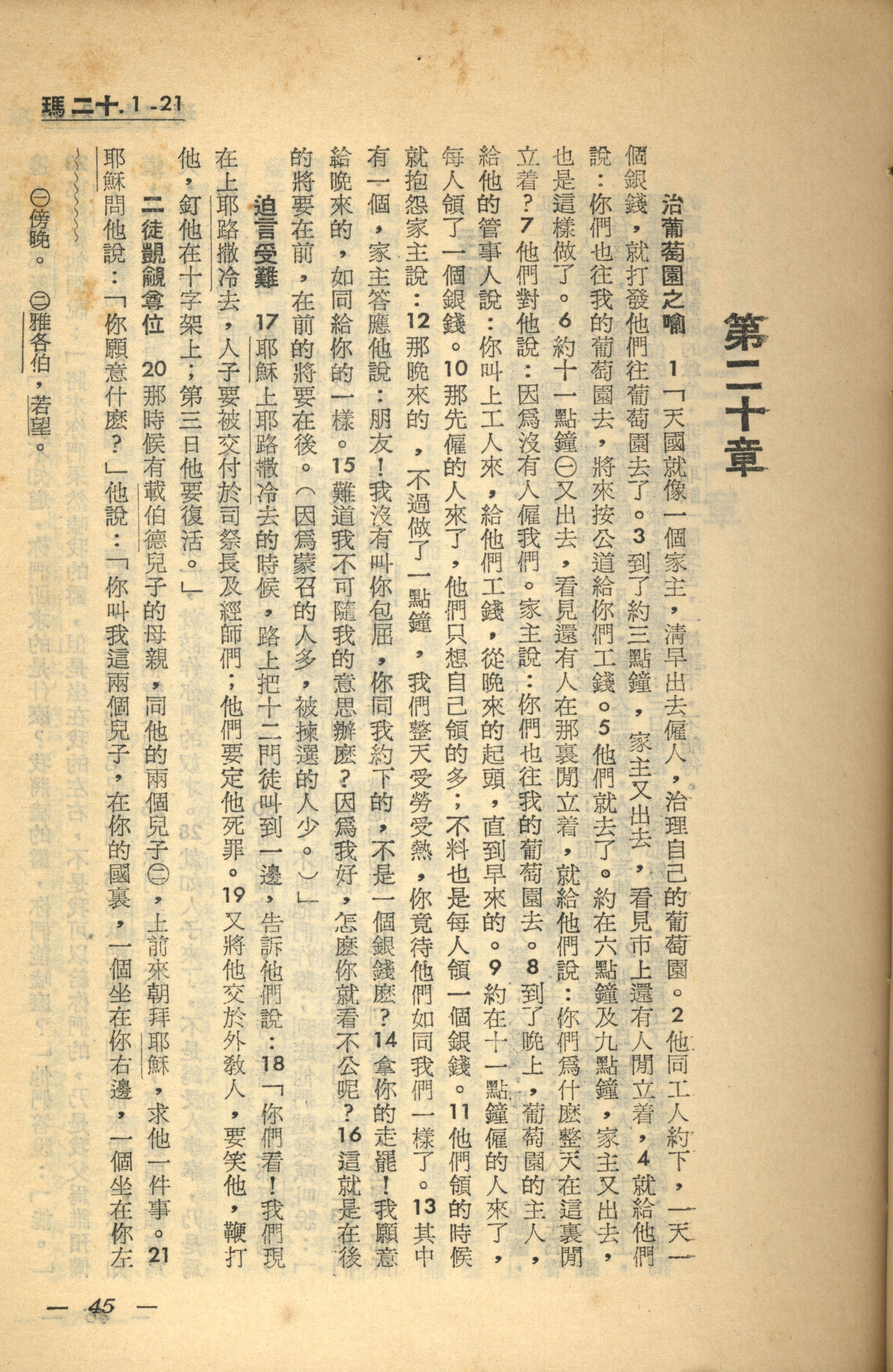1956年新經全集 馬太福音 20 章 1 節到 20 章 21 節