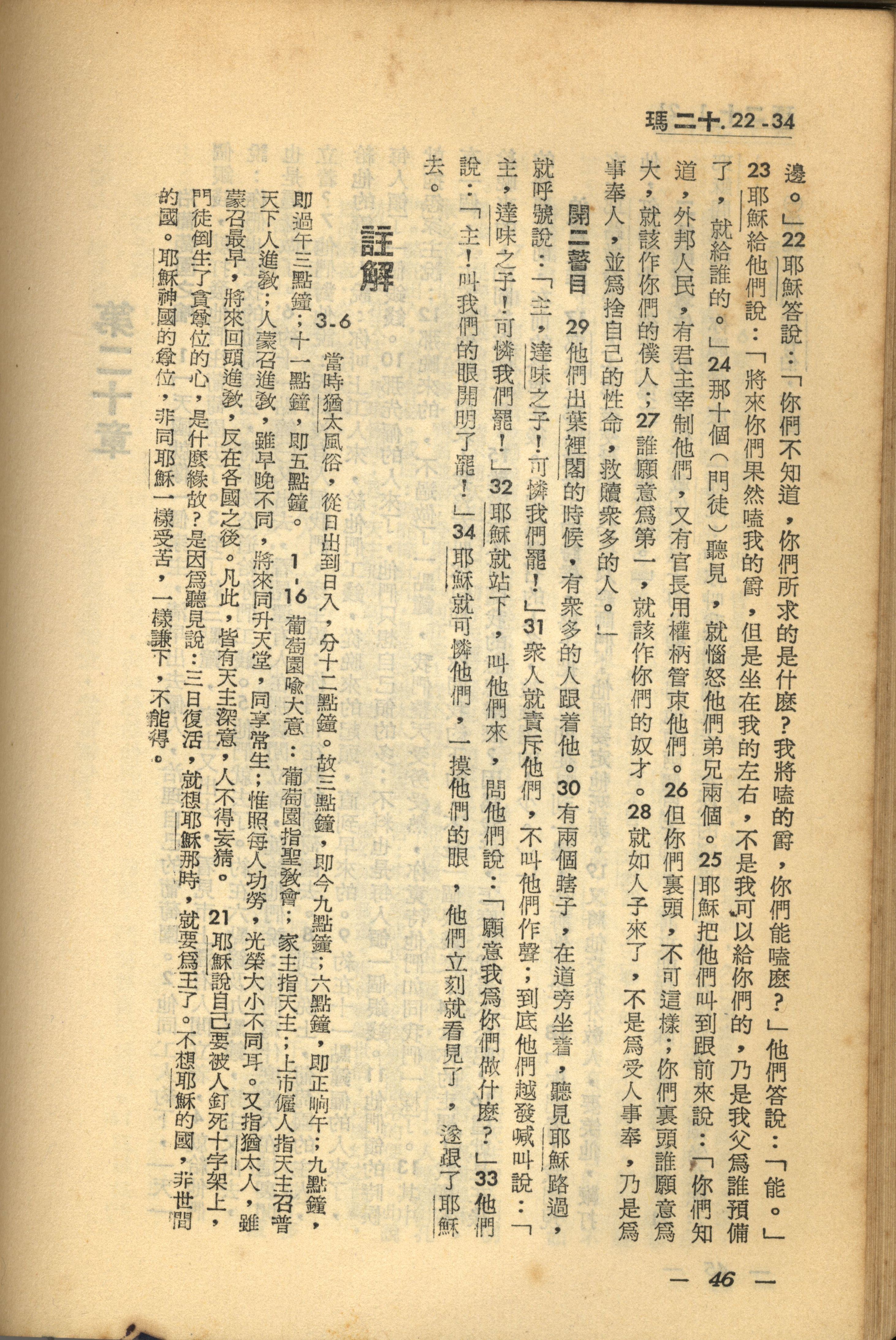 1956年新經全集 馬太福音 20 章 22 節到 20 章 34 節