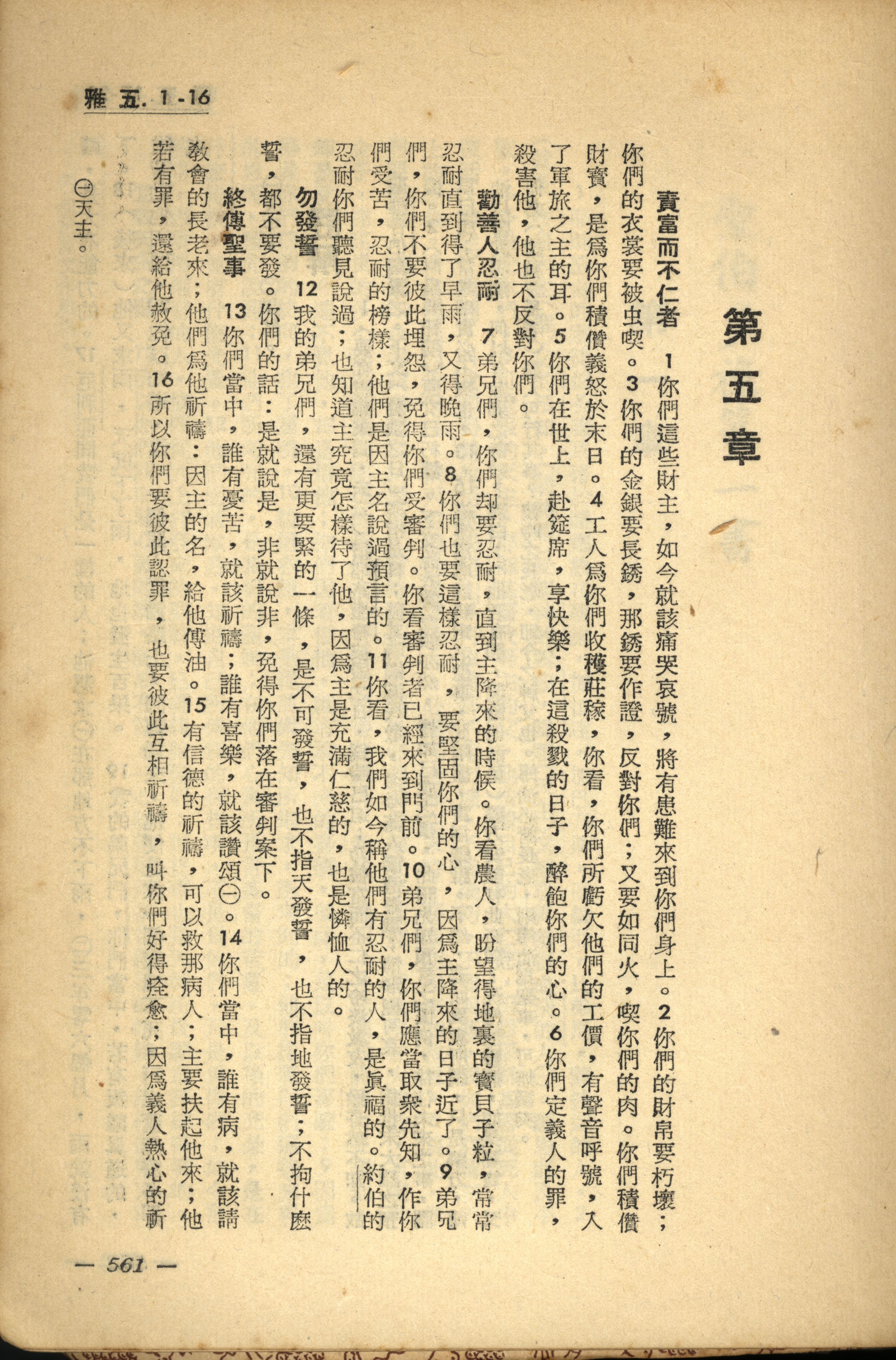 1956年新經全集 雅各書 5 章 1 節到 5 章 16 節