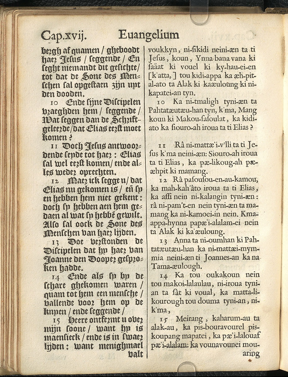1661年新港譯本馬太福音和約翰福音(丹麥皇家圖書館) 馬太福音 17 章 10 節到 17 章 15 節
