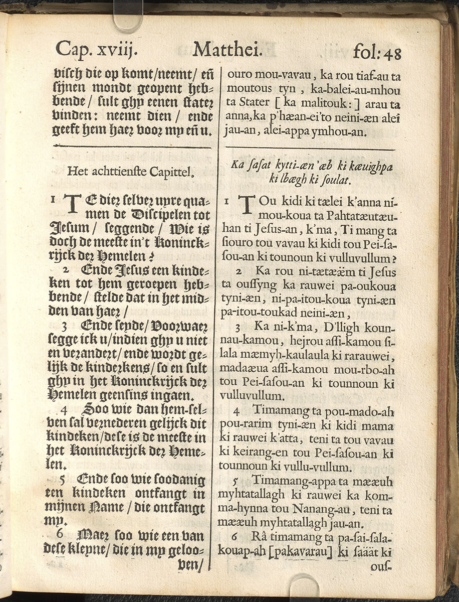 1661年新港譯本馬太福音和約翰福音(丹麥皇家圖書館) 馬太福音 18 章 1 節到 18 章 6 節
