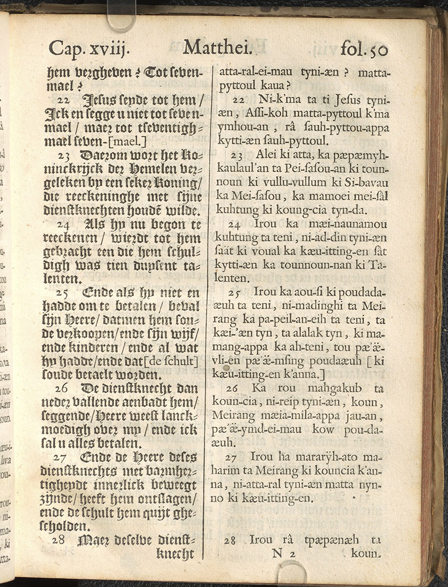 1661年新港譯本馬太福音和約翰福音(丹麥皇家圖書館) 馬太福音 18 章 22 節到 18 章 28 節
