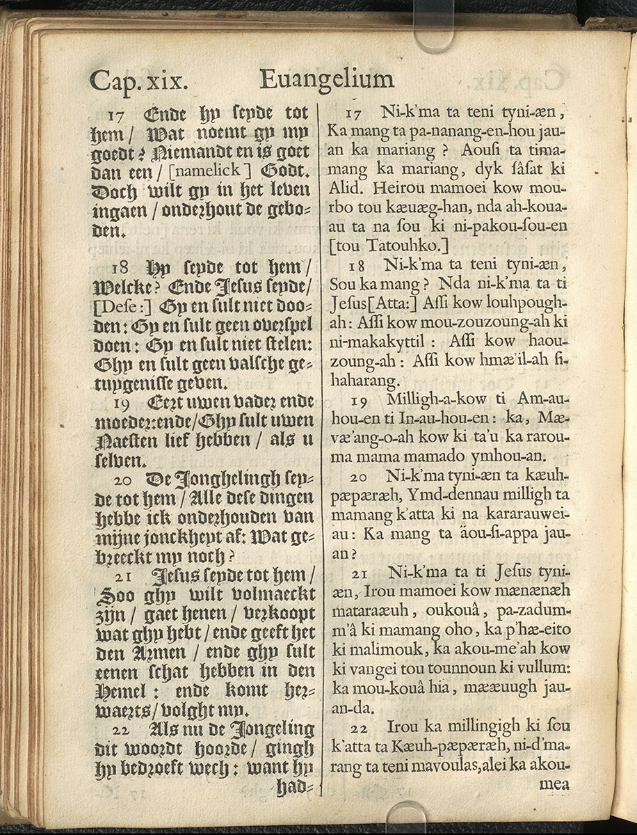 1661年新港譯本馬太福音和約翰福音(丹麥皇家圖書館) 馬太福音 19 章 17 節到 19 章 22 節