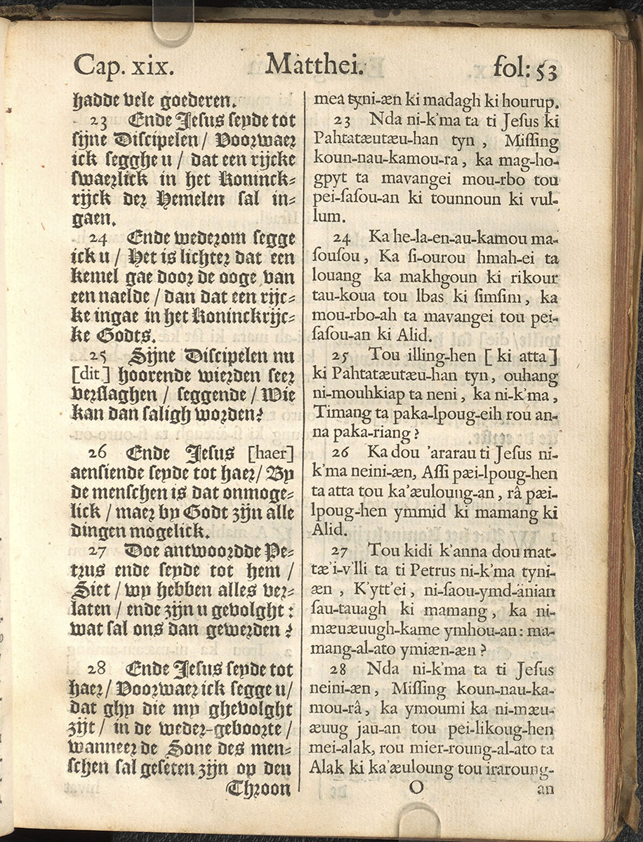 1661年新港譯本馬太福音和約翰福音(丹麥皇家圖書館) 馬太福音 19 章 23 節到 19 章 28 節