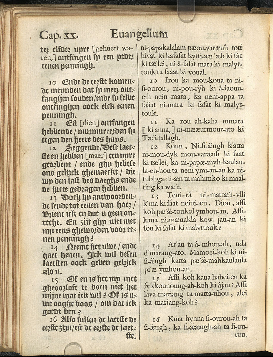 1661年新港譯本馬太福音和約翰福音(丹麥皇家圖書館) 馬太福音 20 章 10 節到 20 章 16 節