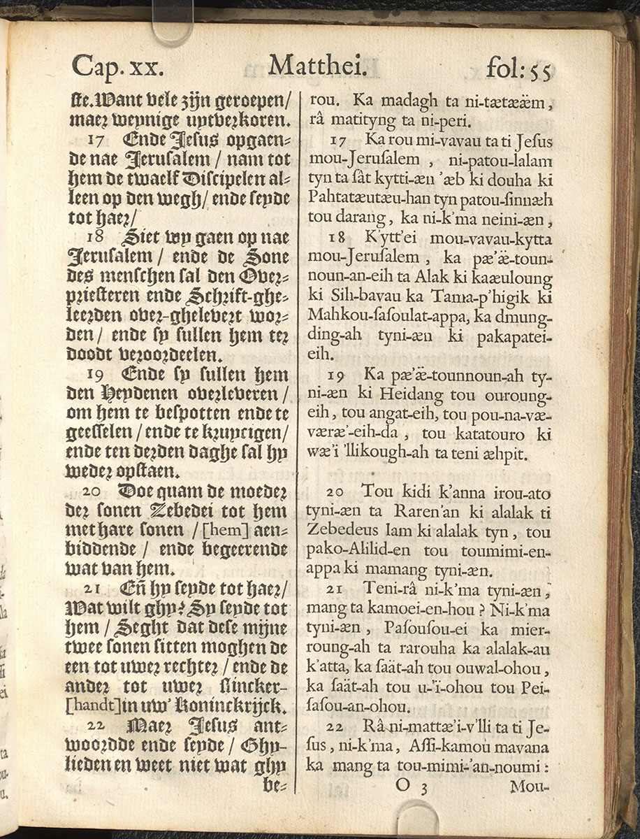 1661年新港譯本馬太福音和約翰福音(丹麥皇家圖書館) 馬太福音 20 章 17 節到 20 章 22 節