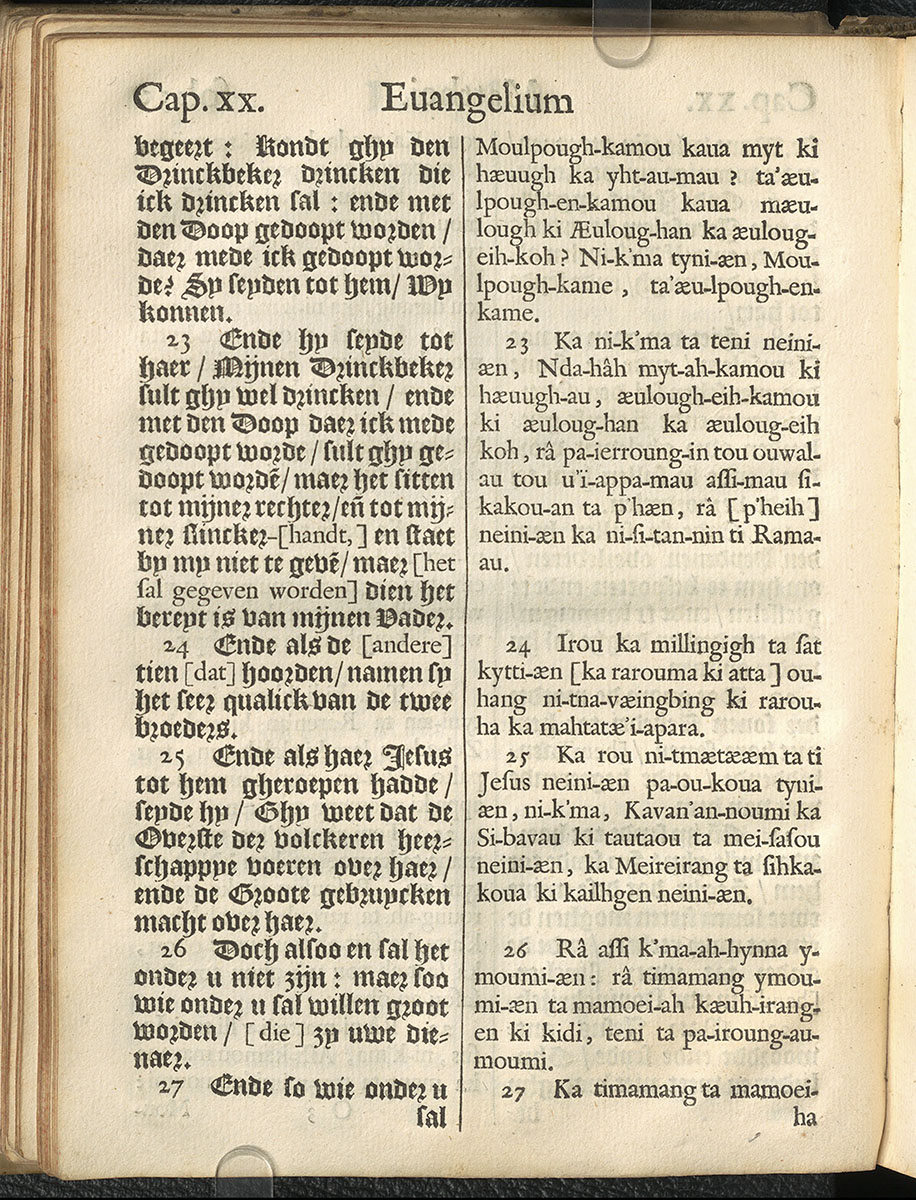 1661年新港譯本馬太福音和約翰福音(丹麥皇家圖書館) 馬太福音 20 章 23 節到 20 章 27 節