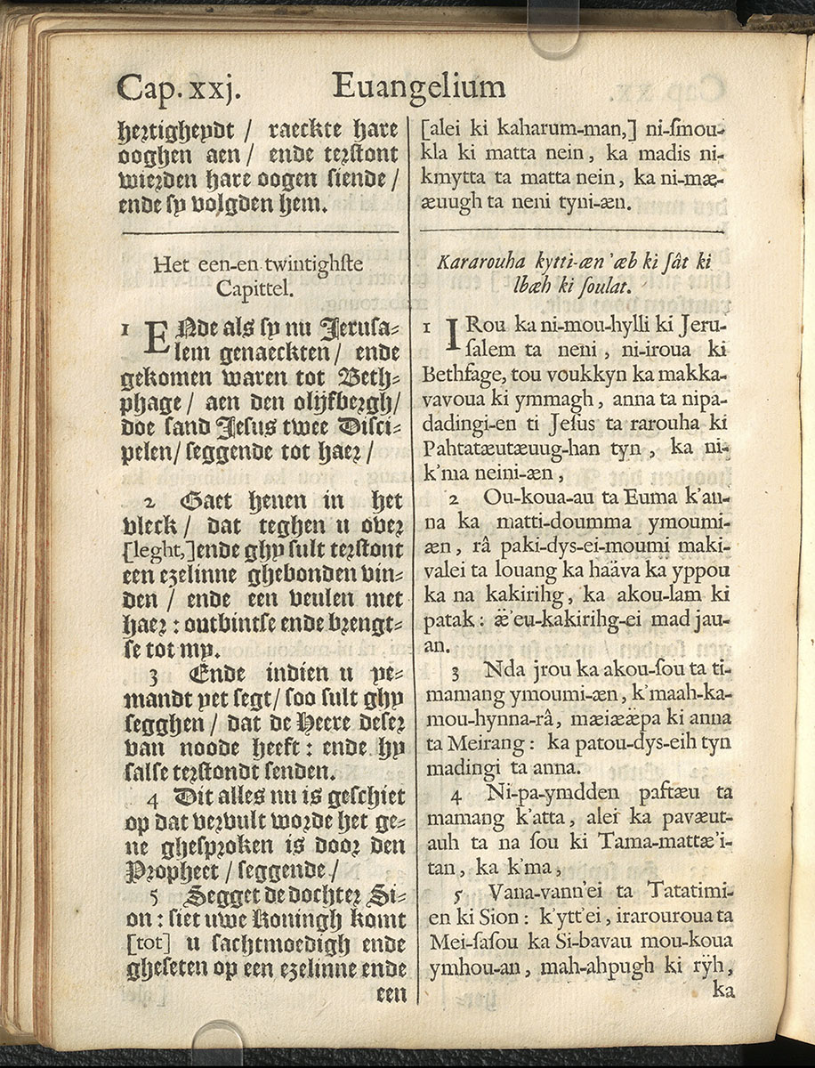 1661年新港譯本馬太福音和約翰福音(丹麥皇家圖書館) 馬太福音 21 章 1 節到 21 章 5 節