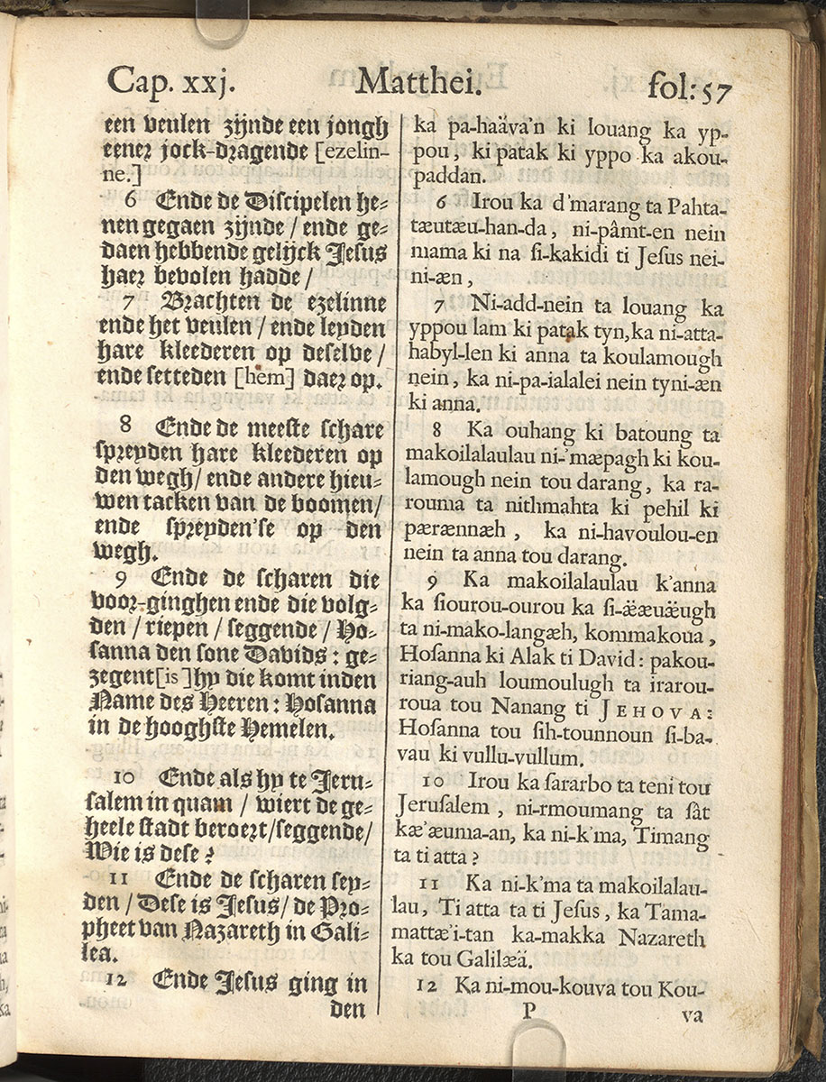 1661年新港譯本馬太福音和約翰福音(丹麥皇家圖書館) 馬太福音 21 章 6 節到 21 章 12 節